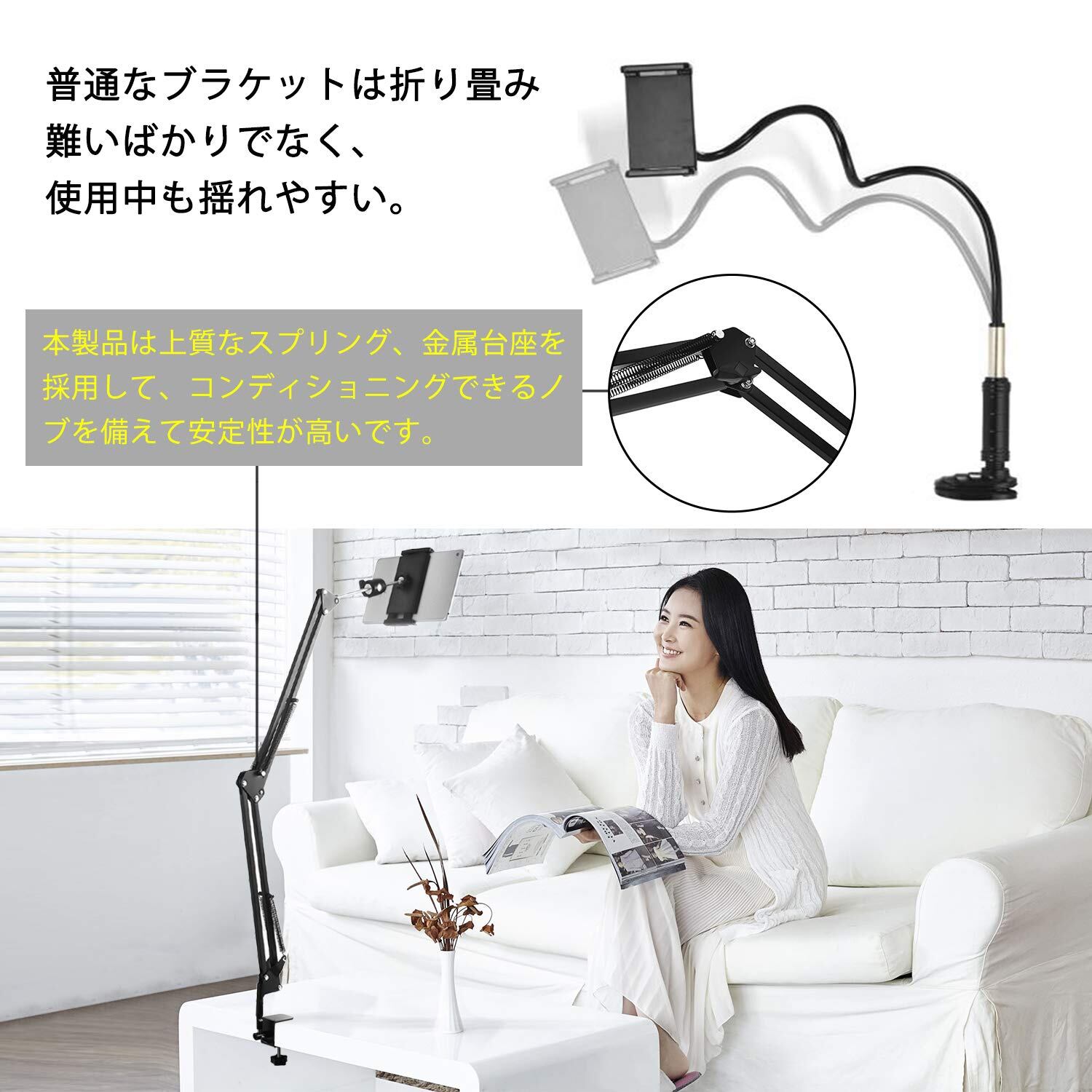 ■ 【耐荷重が強い】最大荷重:1800g: 頑丈で完全に調整可能な4段式アルミニウムアームと上質なスプリング付いたタブレットスタンドです。