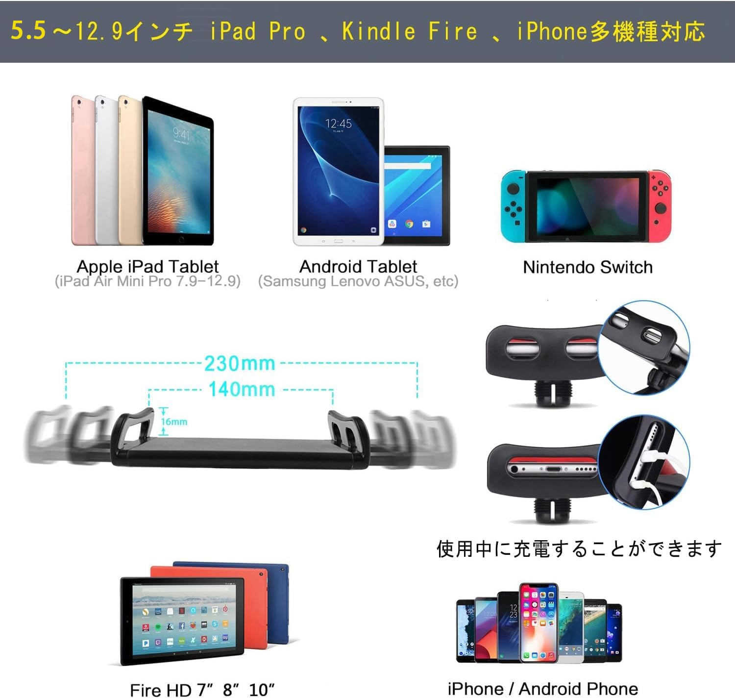 ■ 【対応端末】約5.5-12.9インチのタブレット & スマホ( iPad Pro 7.9 / 9.7 / 10.5, iPad air 2 3 4, iPad mini2 3 4, Galaxy S8 S7 S6, Note 6 5, Android Nexus 7, Kindle, N-Switch, fire hd 8, iPhone XS/XS Max/XR/X 8 7,…)に対応できます。