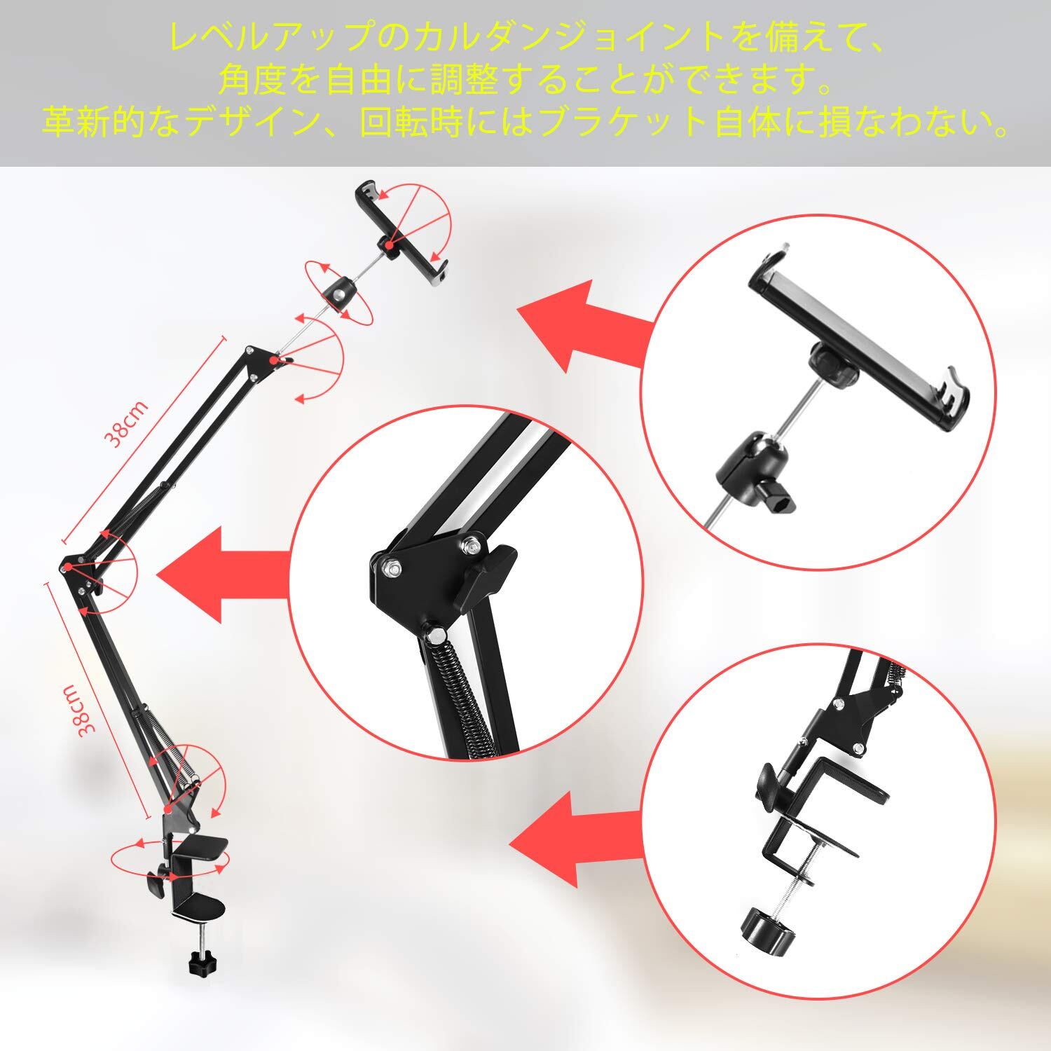 ■ 【四つの回れる関節、自由に調整できる】 最新のスタンドは四つの回れる関節と自由に回る金属ダブルボールを備えて、普通なブラケットより、一層柔軟になります。