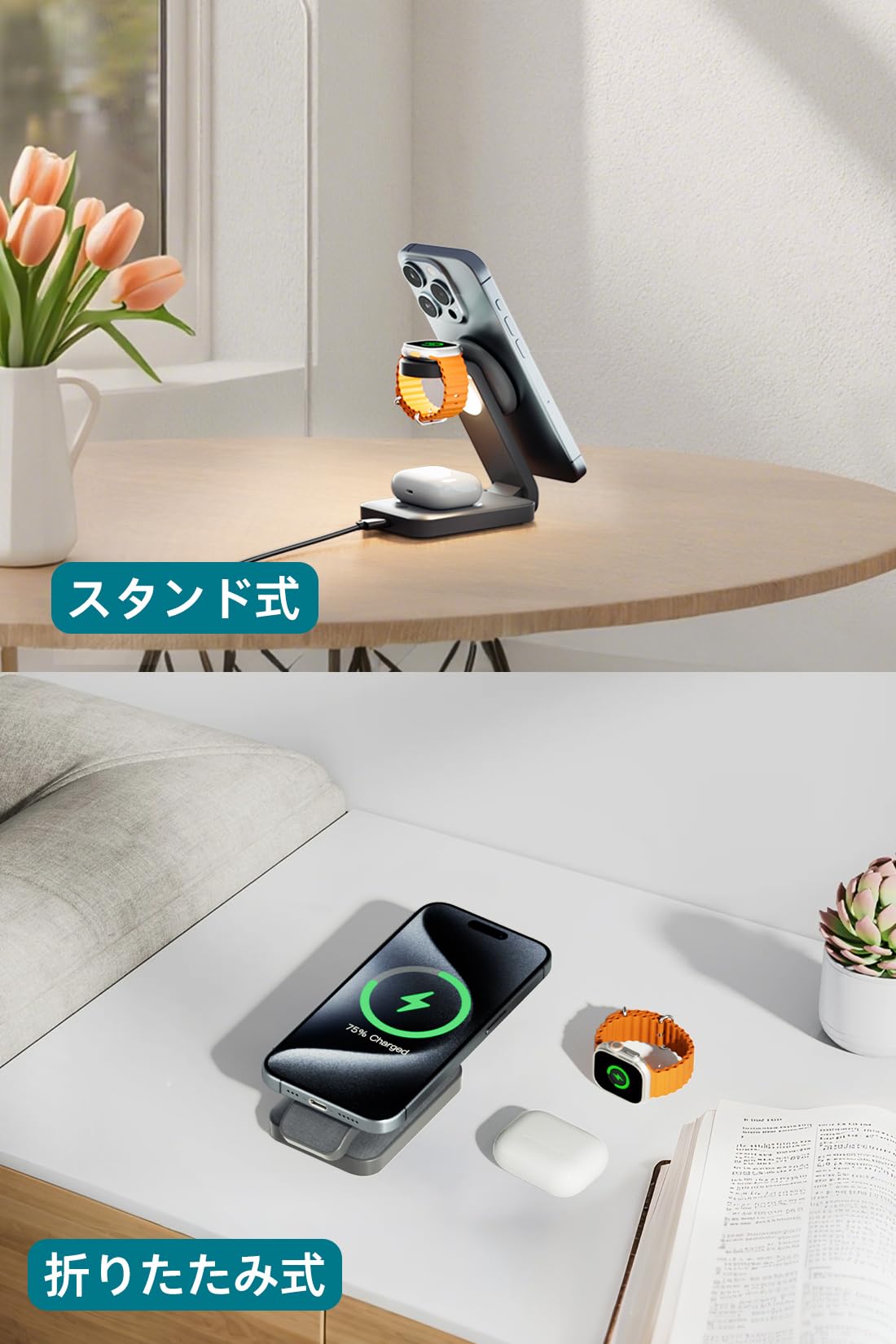 ■ 【携帯に便利な折り畳み式マルチデバイス充電器】軽量で折り畳み可能なデザインが、旅行や移動中の充電シーンに最適。