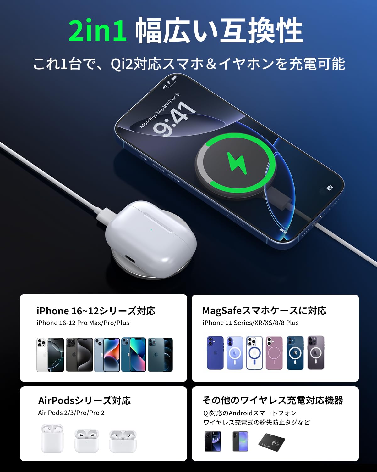 【幅広い機器に対応】①iPhone12/13/14/15/16/17シリーズ対応;②AirPodsPro/AirPods4/3/2に対応;③その他のワイヤレス充電対応機器;④Magsafe対応ケースにも対応。