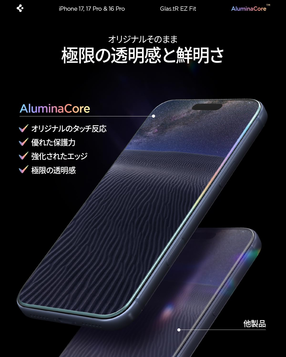 加えて、さらに強化されたアルミナコアガラス(アルミノケイ酸塩:Al₂O₃ + SiO₂)を採用し、一般的な強化ガラスと比べて約10倍の耐衝撃性を実現。