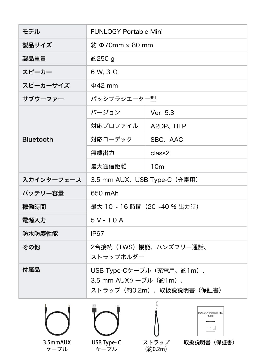 ■ 【商品仕様】(本体)サイズ:W 70 mm × D 70 mm × H 80 mm / 重量:250 g / スピーカーユニット:42 mm / 出力:6 W / インピーダンス:3 Ω / SN比:100 dB / Bluetooth:ver. 5.3 / 最大通信距離: 10 m(障害物が無い時) / 入力インターフェース:USB Type-C、AUX / 電源:DC 5 V 1.0 A / バッテリー容量:650 mAh / 稼働時間:10 時間(40 % 出力時) / 防水性能:IP67 / その他:TWS、ハンズフリー通話 / 付属品:USB Type-Cケーブル(1m)、3.5mm AUXケーブル(1m)、ストラップホルダー(約0.2m) 取扱説明書