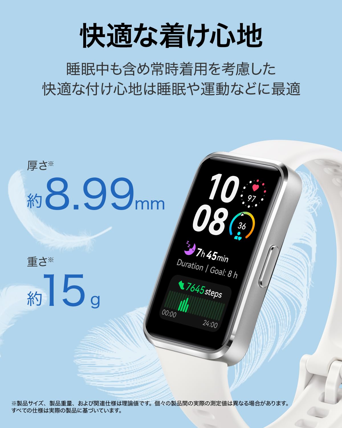 使いやすさ、通気性、フィット感などを考慮して設計された厚さ約8.99mm、重さわずか約15gのデザインは、日常だけでなく睡眠中や運動中などあらゆる常時着用するシーンで軽く快適な着け心地。