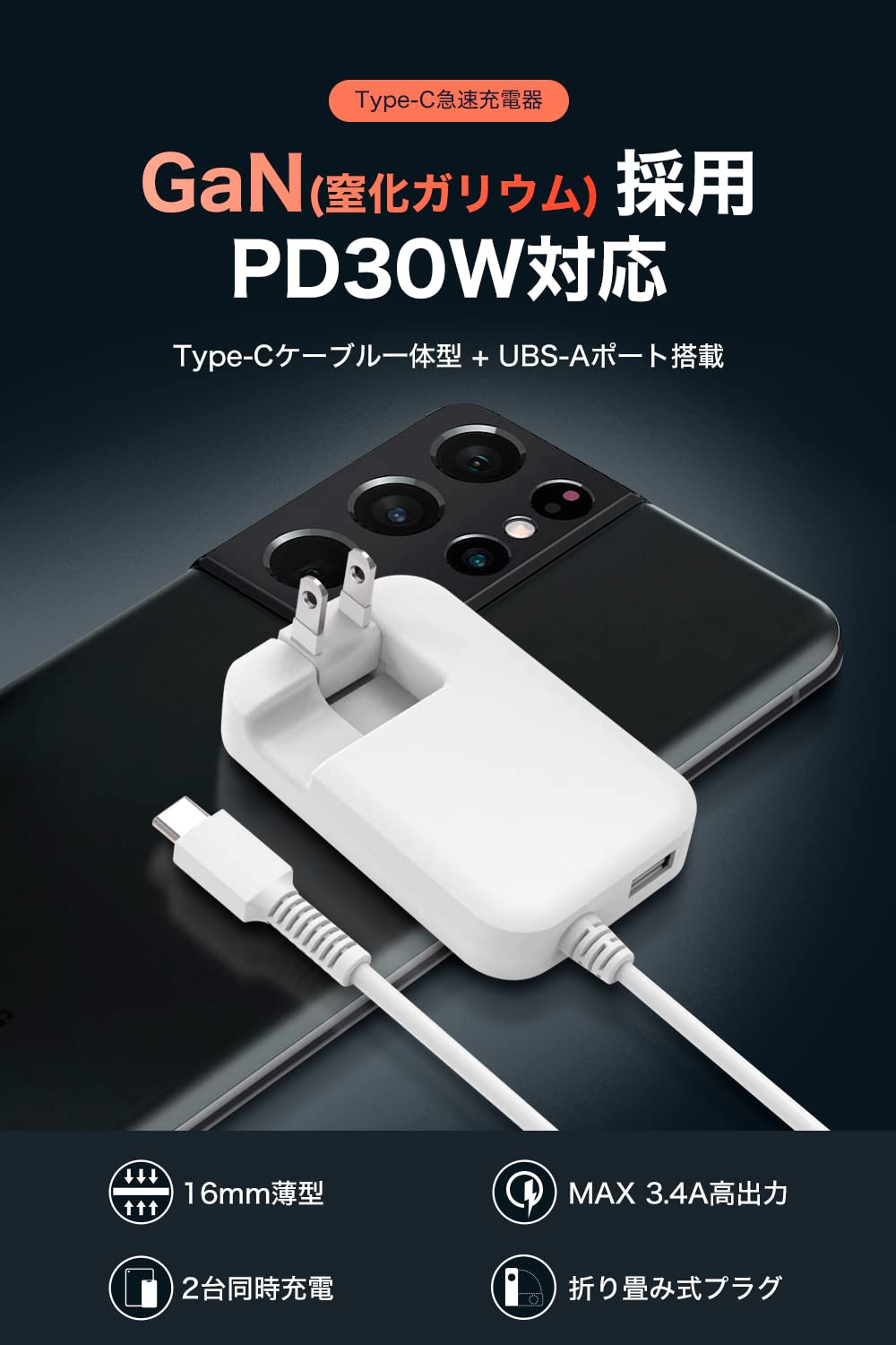 【新版】USB充電器 PD30W 急速充電器 Type-C 充電器 タイプc GaN30w(PD30W&QC3.0/Type-Cケーブル&USB A/PSE認証/16mm超薄型)スマホ充電器 折りたたみ式プラグ 2つ同時充電 ACアダプター コンセント iPhone15 Pro/Galaxy/Android/Switchその他 USB-C/USB-A各種機器対応