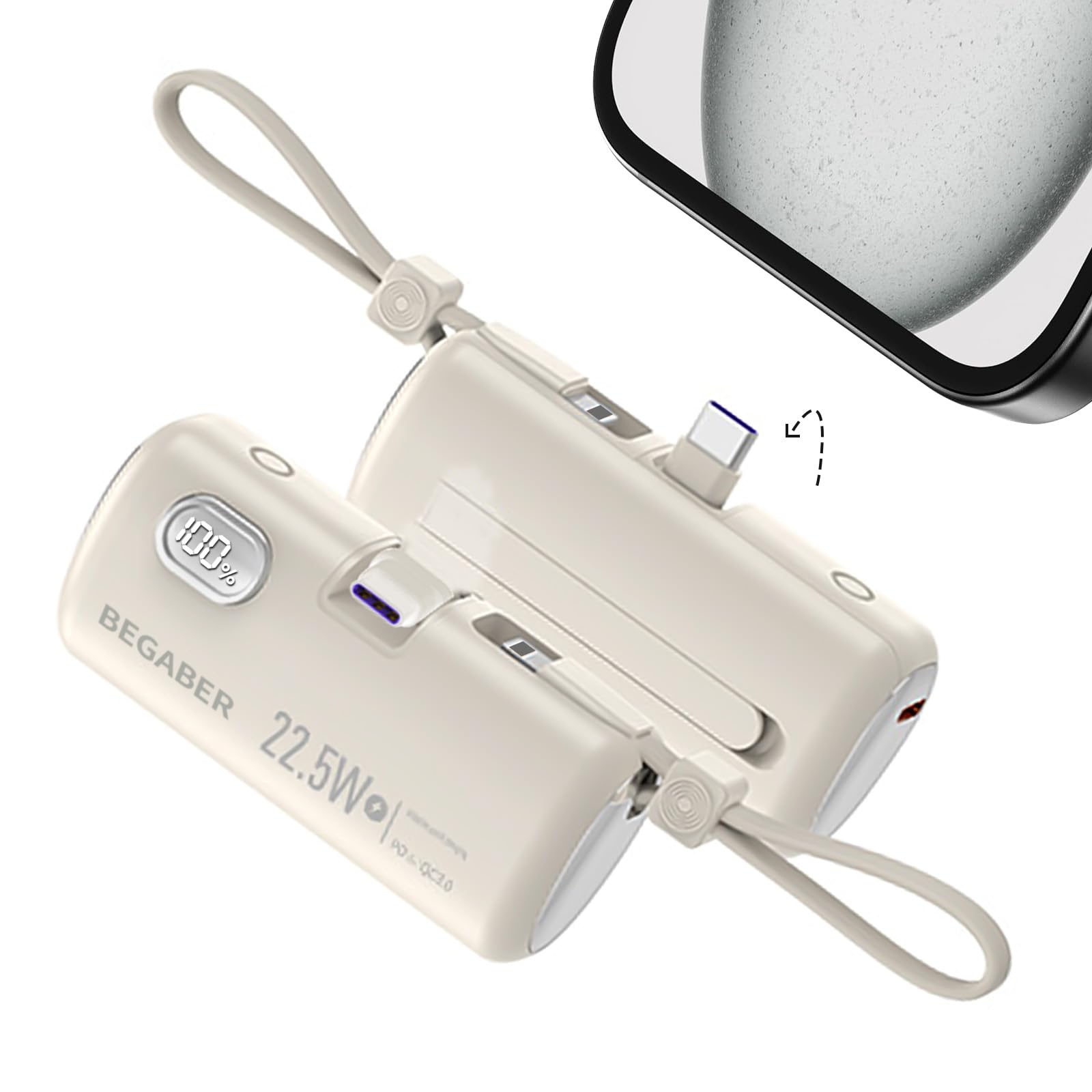 BEGABERモバイルバッテリー 軽量 小型 iPhone 15/16 6000mAh大容量 PD&3A急速充電 タイプC端子一体型 コードレス 直差し スマホ充電器 折りたたみ式タイプC端子 iPhone 14ケーブル内蔵 LCD残量表示 持ち運び充電器 機内持ち込み PSE認証済 iPhone/iPed/Android各種対応 P101(ベージュ)