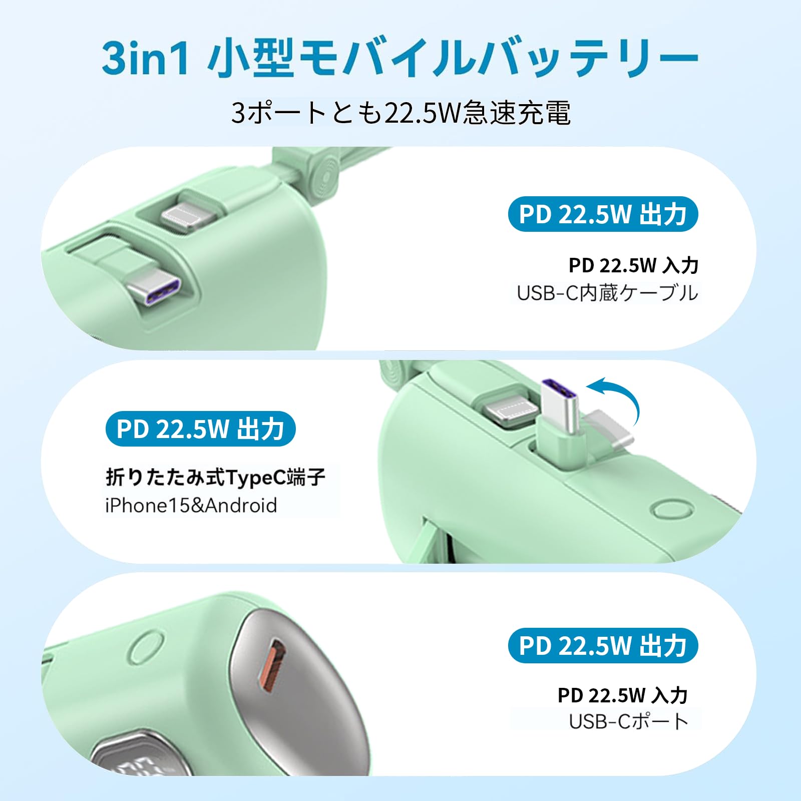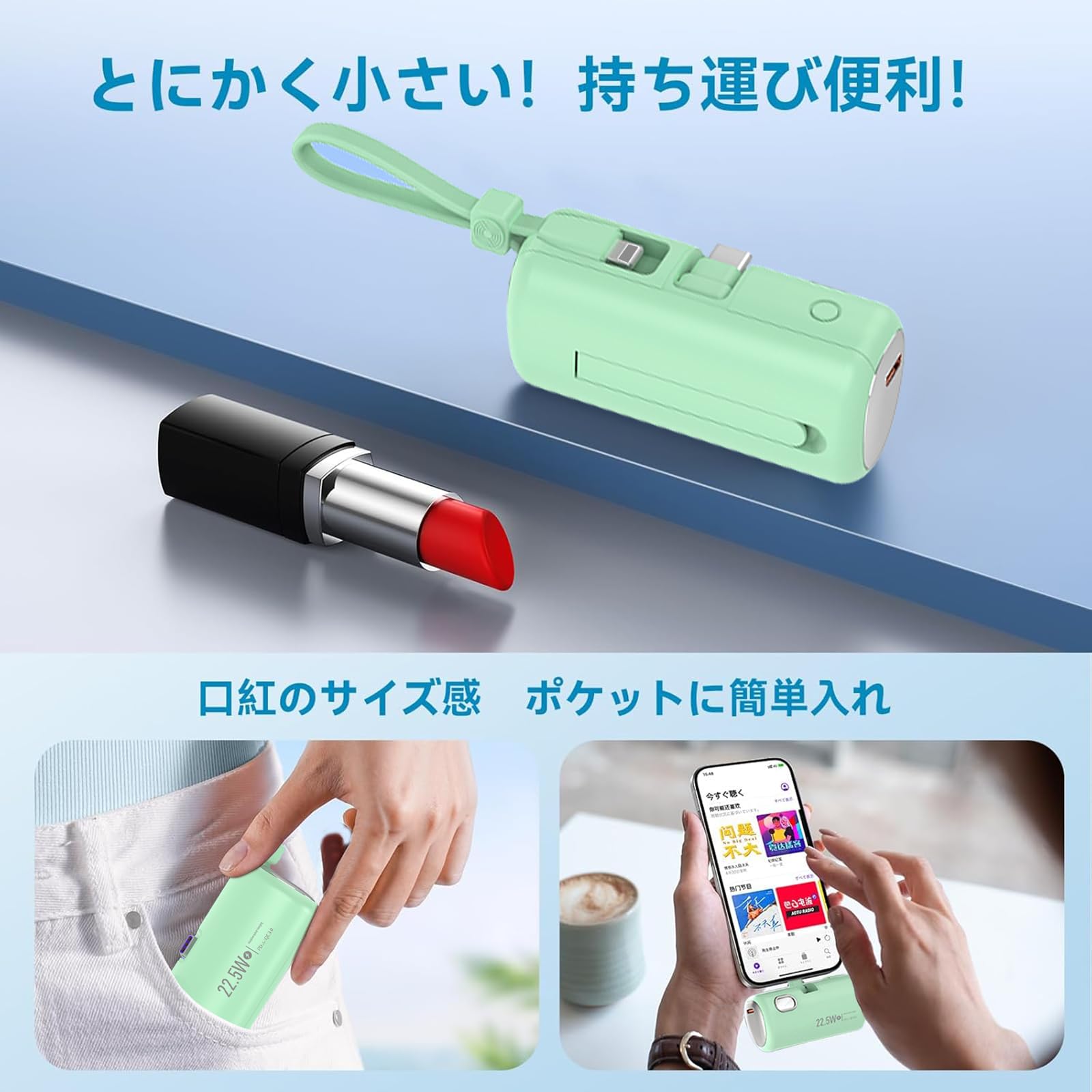 超コンパクト設計ながら6000mAh大容量で、PD22.5W&3A急速充電も対応可能です。