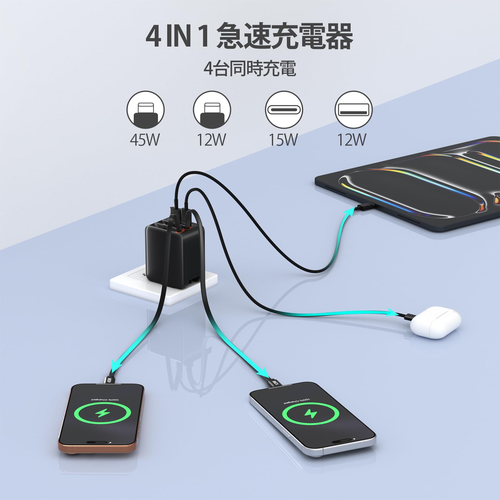 充電器 Type-C 45W 急速充電 自動巻き取り式 2本Type-C充電ケーブル付き PD対応 2本USB-Cケーブル & USB-C ポート& USB-A ポート 4台同時充電 タイプcケーブルー体型 折りたたみ式プラグ MacBook/ノートPC/iPad/iPhone/Androidなどに対応 旅行や出張に最適