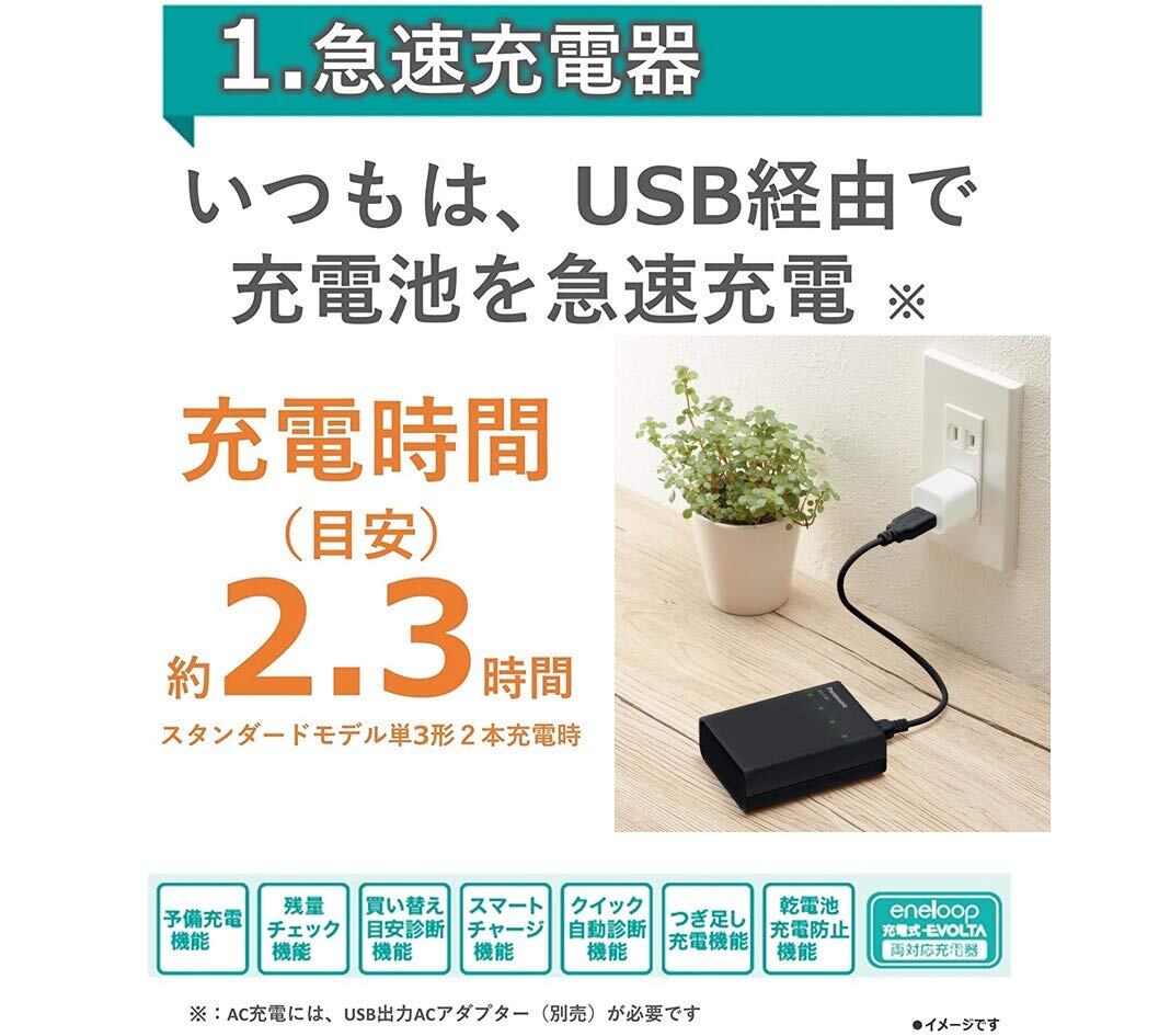 ■ エネループ単3×2本を約2.5時間で急速充電。