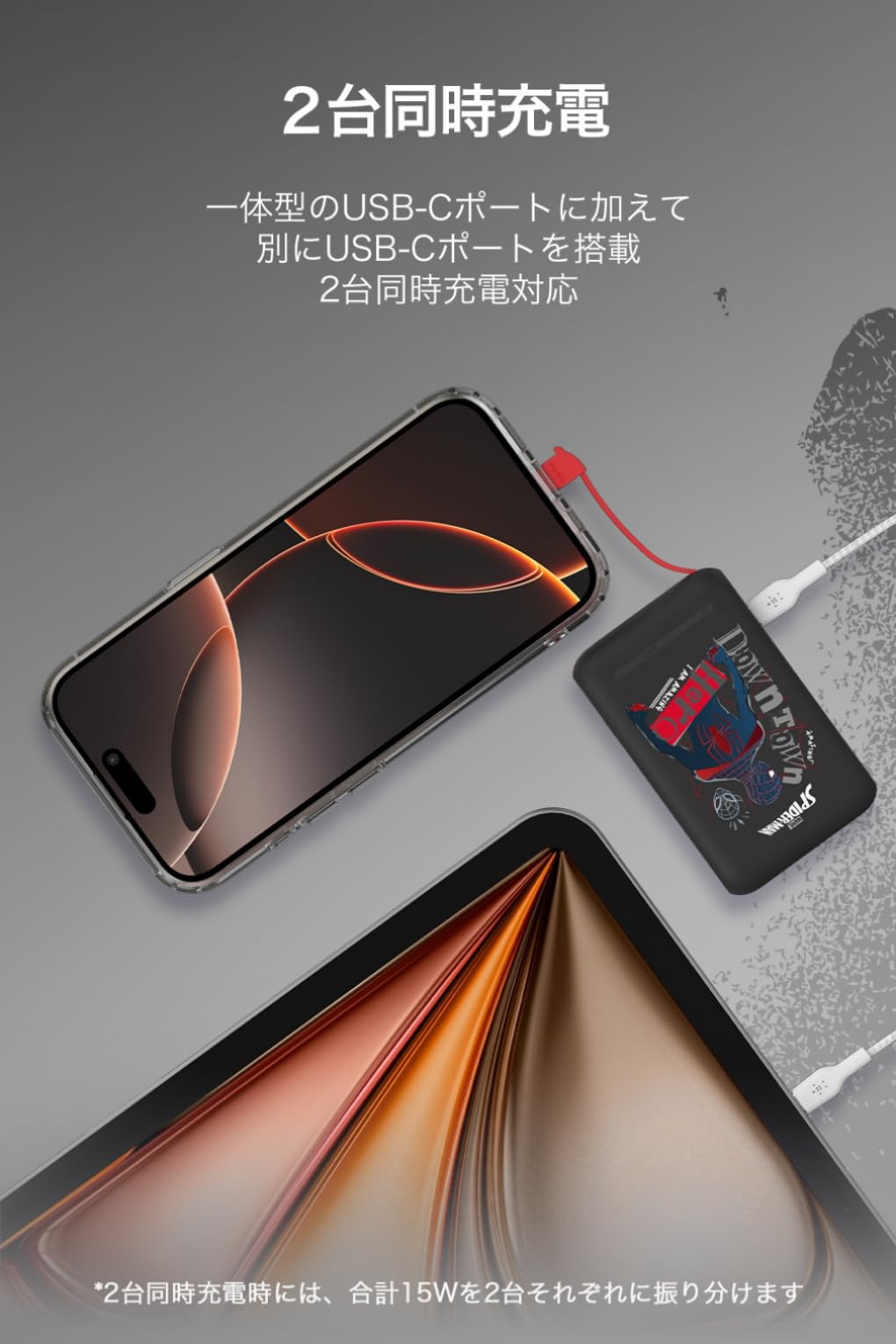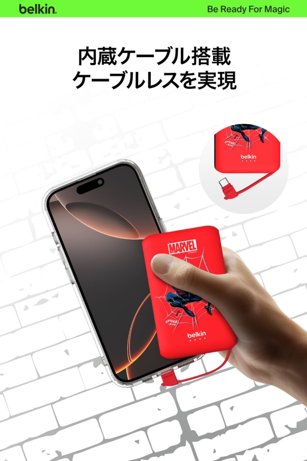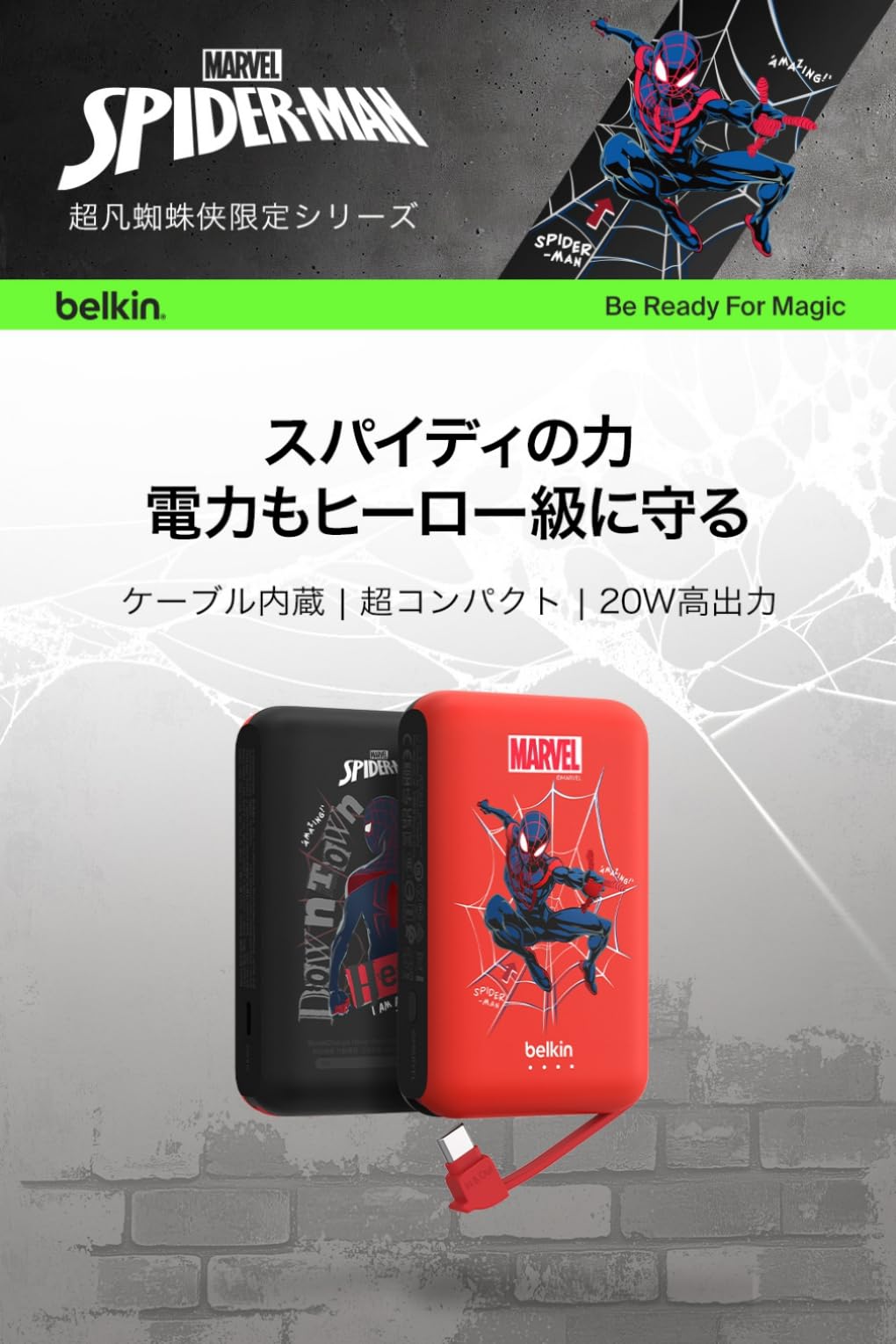 【スパイダーマン】Belkin モバイルバッテリー(10000mAh 20W USB-Cケーブル内蔵)3C対応 CCC 最大20W PD高速充電対応 PPS対応 iPhone&Androidスマホ対応 2台同時充電 PSE認証 軽量&コンパクト 機内持込可能 アウトドア/災害/緊急用の便利グッズ メーカー保証2年 BPB021qcBR-DY