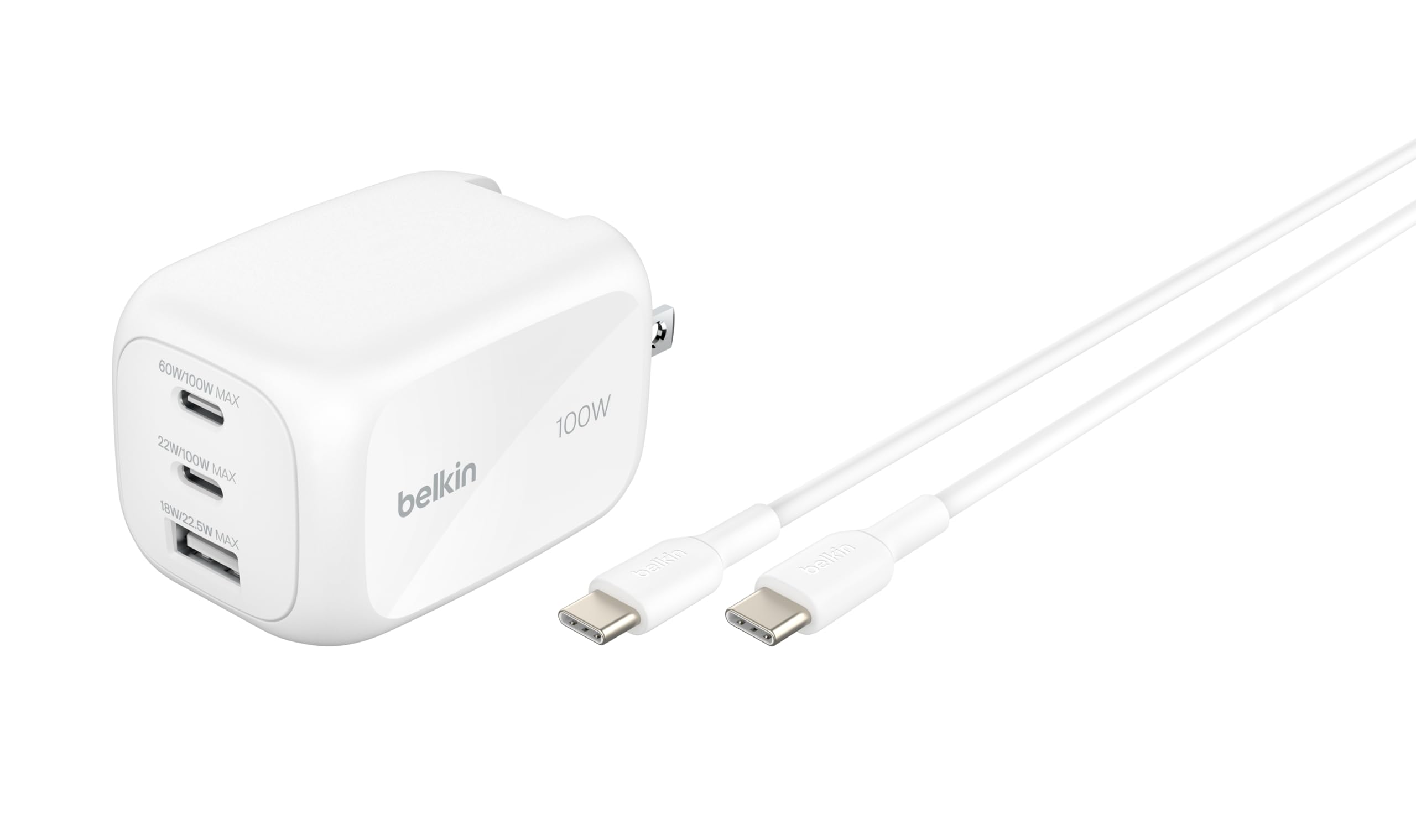 Belkin Boost Charge Pro 100W 急速充電器 USB-C type-c タイプ c PD 3.1×2 USB-A×1 iPhone 17,16~12対応 高速充電対応 PPS対応 iPad対応/iPhone対応/Android対応 タブレット各種対応 旅行や出張に最適 折りたたみプラグ PSE認証 USB-C to C 2mコード付 ホワイト WCH016qc2MWH-B6