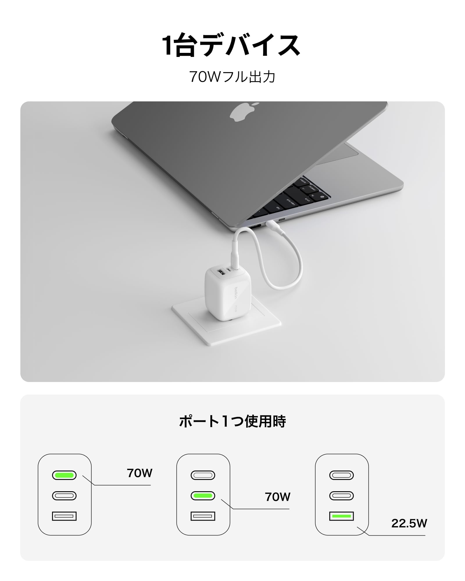 Belkin Cubic Chager Pro 3ポート GaN iPhone17,16~12 急速充電器 70W USB-C×2 USB-A×1 高速充電対応 3台同時充電 PPS ACアダプター 旅行や出張に最適 折り畳みプラグ PSE USプラグ ホワイト WCH018qcWH-A ※ 壁紙ダウンロード付き