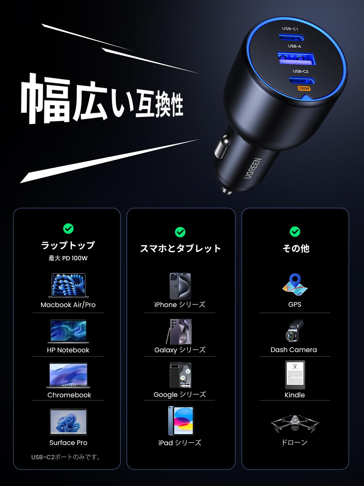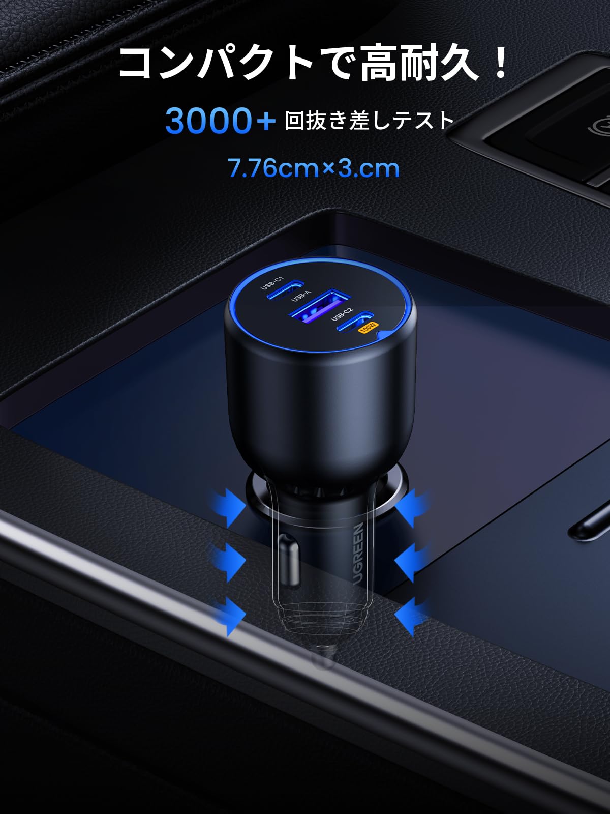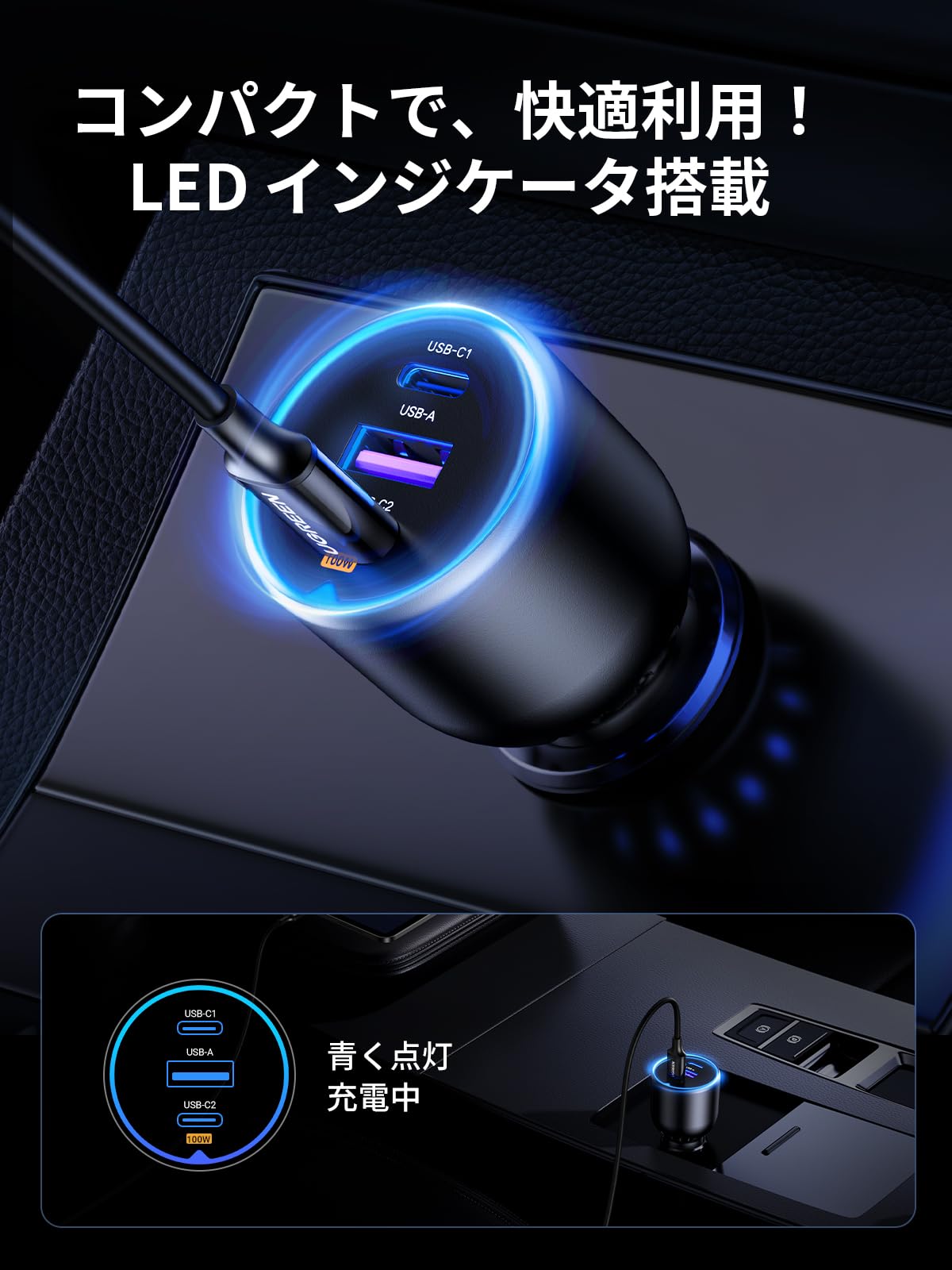 UGREEN 130W シガーソケット usb-c カーチャージャー 3ポート【PD 100W/30W+SCP 22.5W】PD3.0/QC4.0/PPS対応 車載充電器 コンパクトサイズ 耐久性 シガーソケット 急速充電器iphone17/13/12, Galaxy S22/S21 Ultra, iPad, MacBook,ラップトップなどに対応 【ケーブル付属なし】