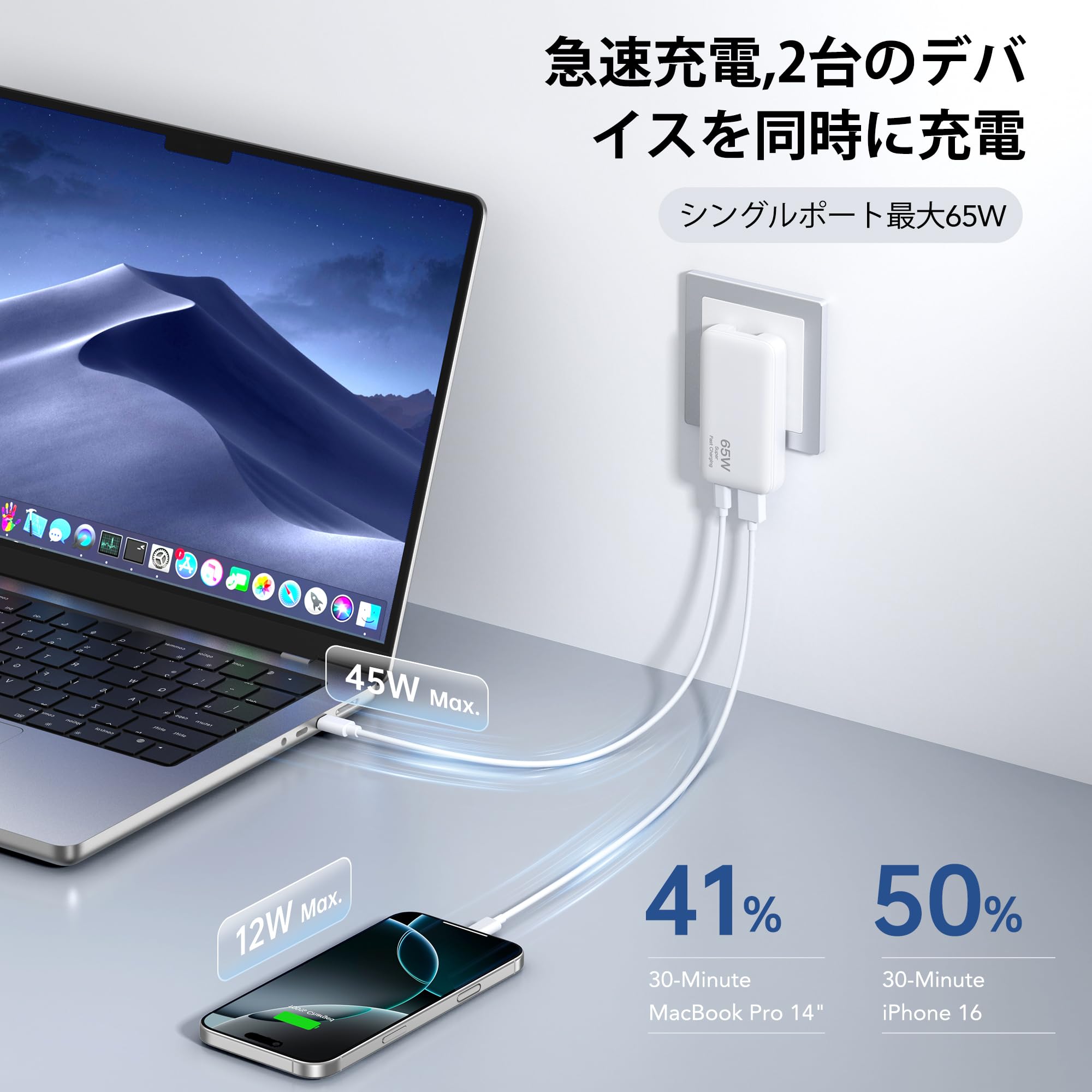 BREEKET iphone 16 充電器 ACアダプター 急速充電器 PD65W USB コンセント(65W PD3.0&27W QC /2ポート/PSE認証) タイプc USB-C電源 iPad/iPhone/Android/AirPods Series など多機種対応 ホワイト