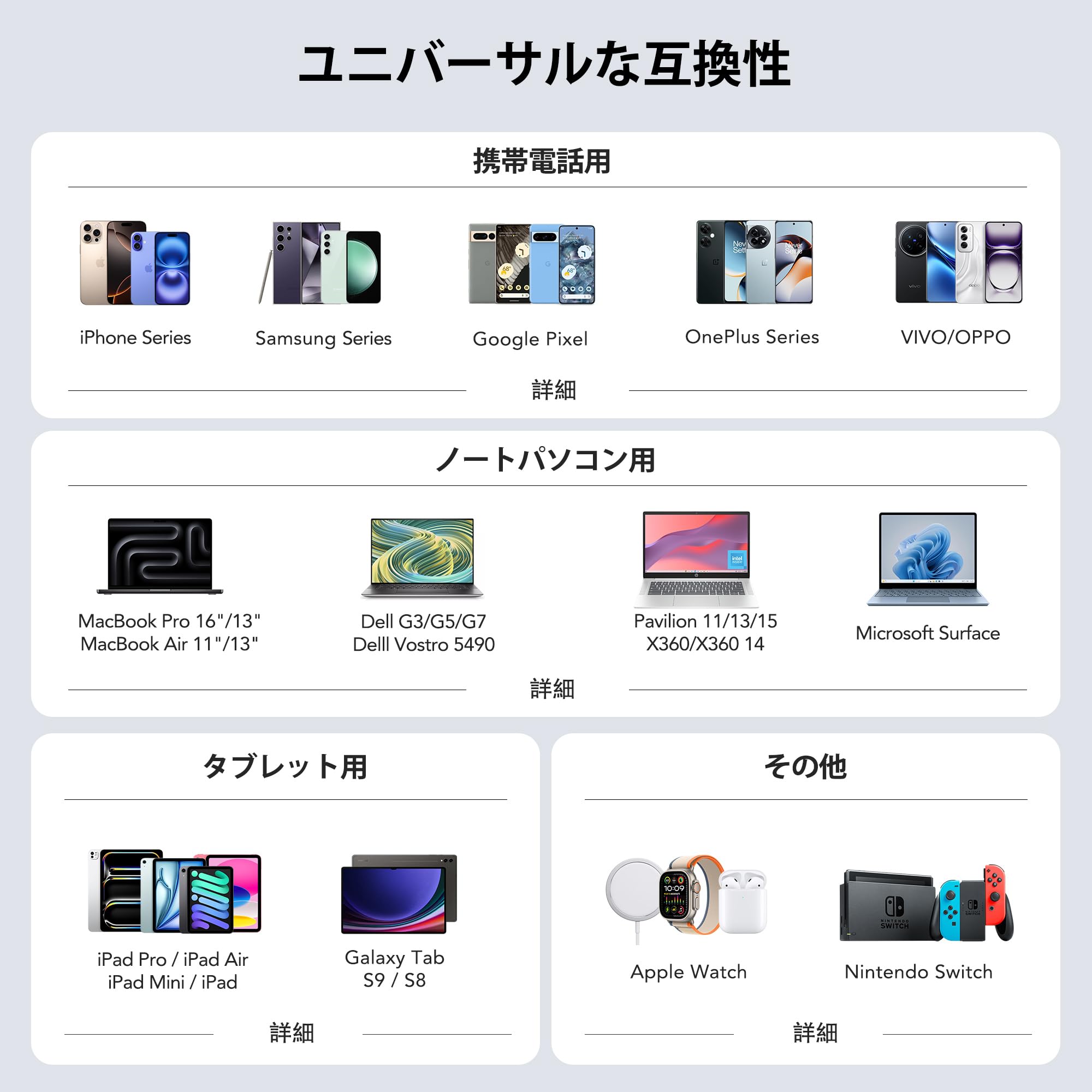 ユーザーは電話、タブレット、ヘッドフォンを同時に充電して、待ち時間を最小限に抑えることができます。