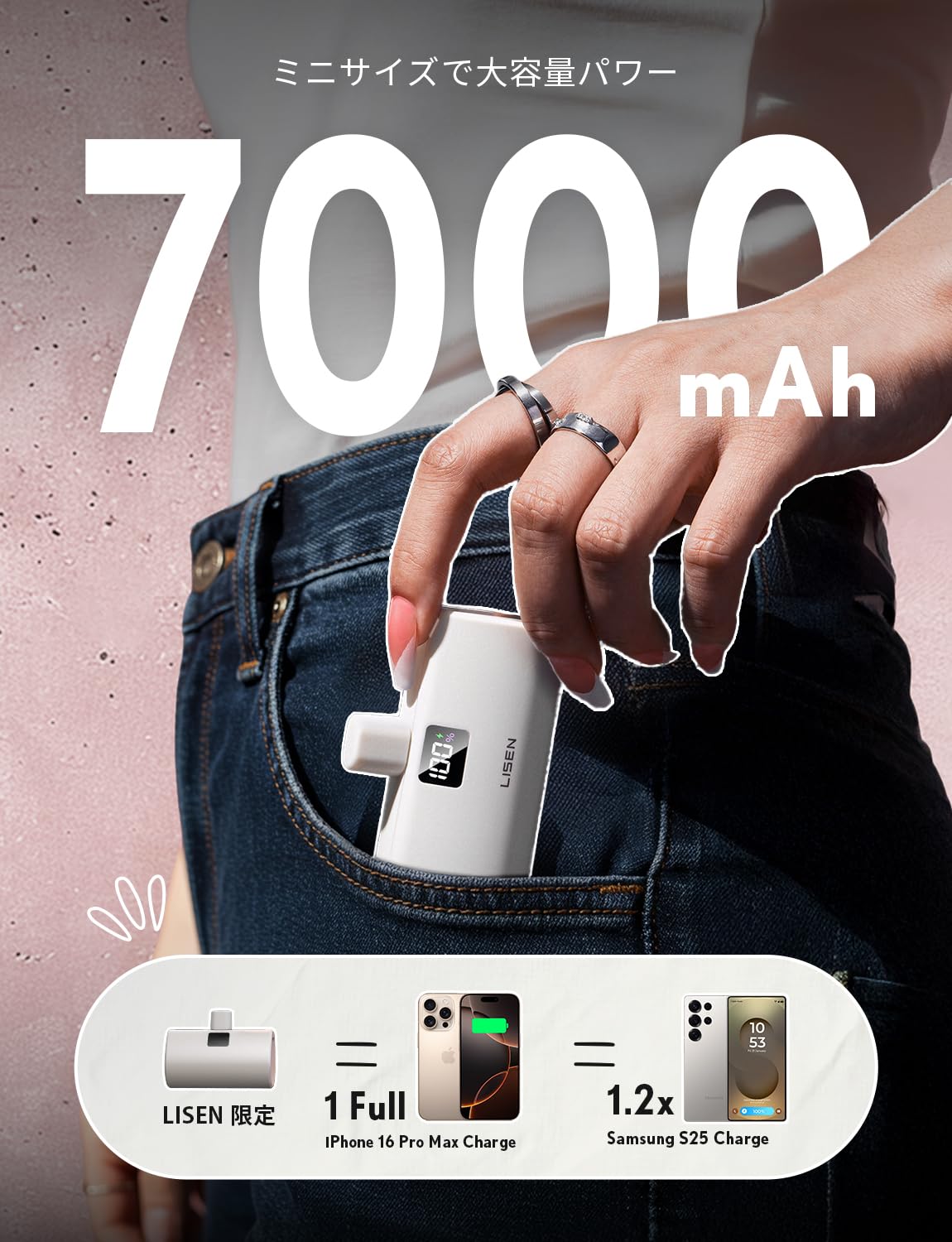 ■ 【最小サイズで最大容量】 LISEN 7000mAh モバイルバッテリー 軽量 小型 は、従来の5000mAhモデルと同じコンパクトサイズながら、実際の出力容量は最大4080mAh。