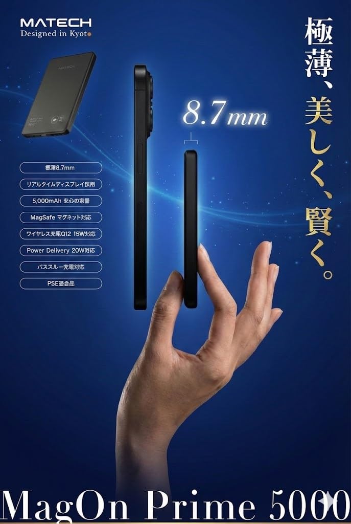 ■ 【わずか8.7mmの極薄ボディ】5000mAhの大容量ながら、驚きの薄さ8.7mmを実現。