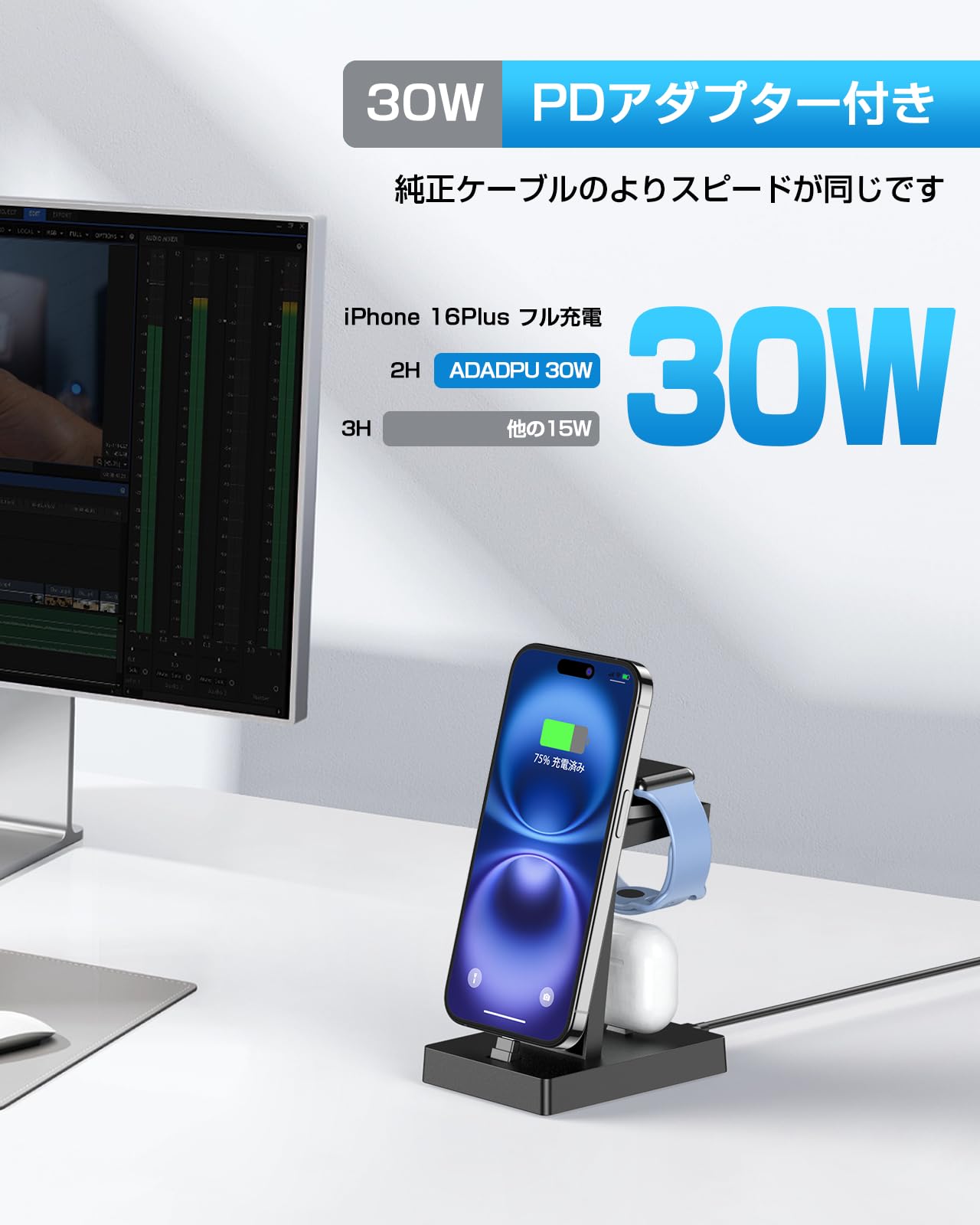 ■ 【30W急速充電スタンド】スマホ・イヤホン・Apple Watchを一気に充電!AppleとAndroidスマホを最大30Wでサクサク充電!普段の充電よりも大幅に時間短縮できます。