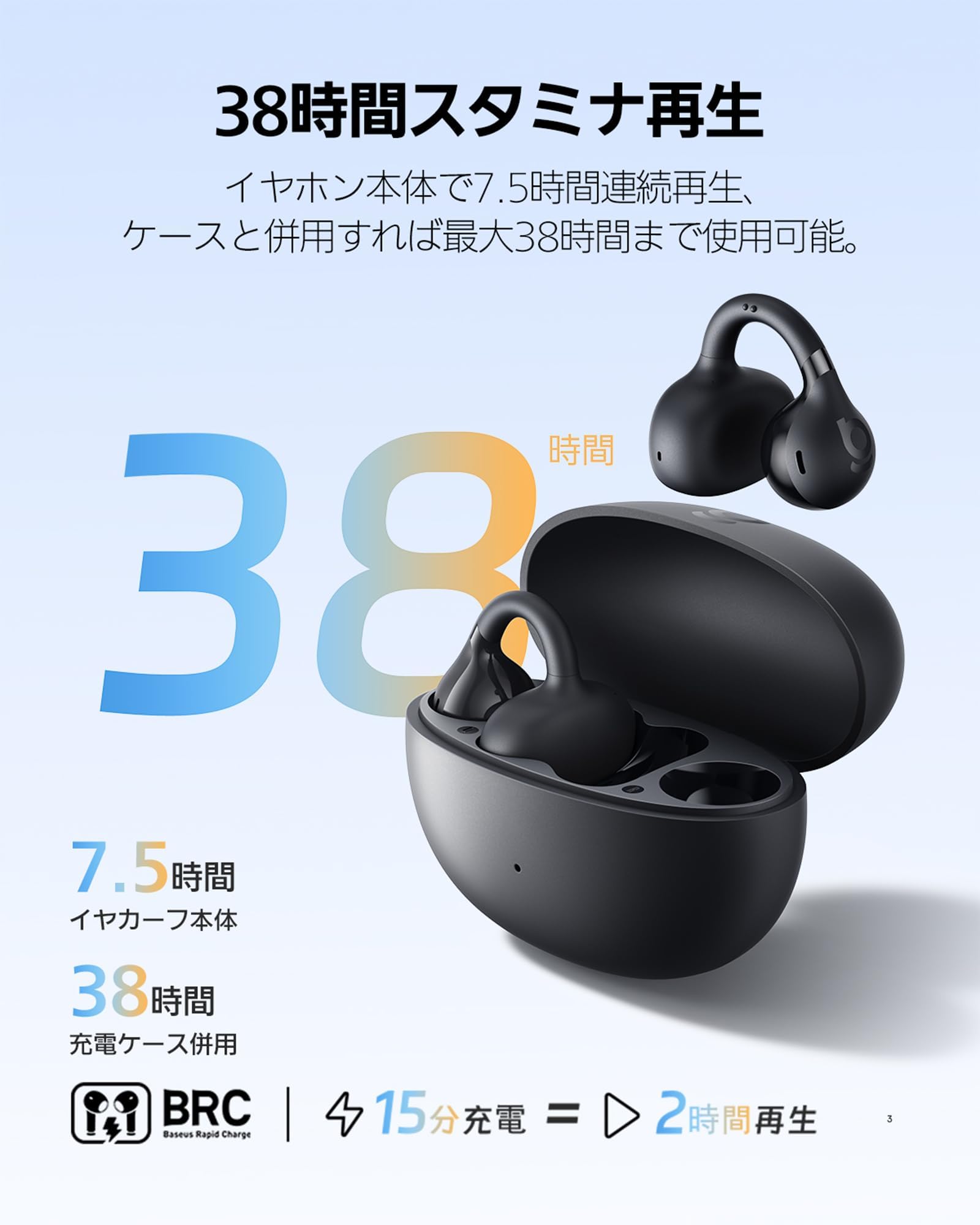 「VGP2025 受賞」Baseus Bass BC1 イヤーカフ イヤホン ワイヤレスイヤホン オープンイヤー 【 最大38時間再生 / Bluetooth 6.0 / ベースブースト機能 / IP55防水 / 専用アプリ/大音量 音漏れ防止 】 耳を塞がない 耳挟み式 完全ワイヤレス 開放型 急速充電対応 マルチポイント接続 (ブラック)