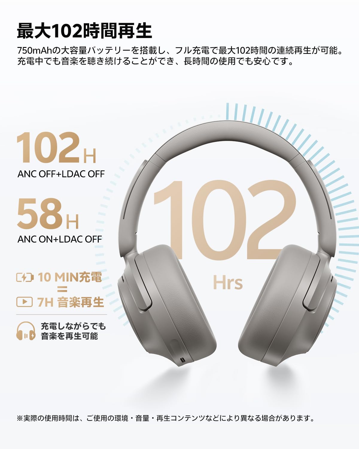 * 【長時間でも安心の大容量バッテリー】このワイヤレスヘッドホンは、750mAhの大容量バッテリーを搭載し、フル充電で最大102時間の連続再生が可能。長時間の使用や旅行、出張でもバッテリー切れの心配はありません。さらに、充電しながらの音楽再生にも対応しており、思う存分サウンドを楽しめます。ケーブル接続時でも、ヘッドホン本体のマイクとANC機能はそのまま使用可能です。(※再生時間は設定や使用環境によって異なる場合があります)