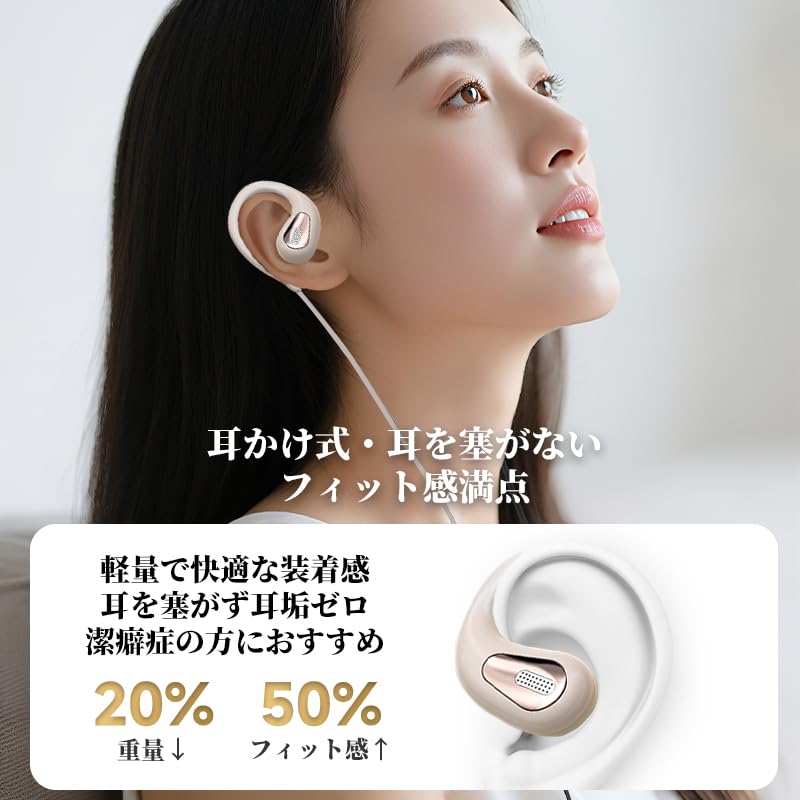 【初登場】 イヤホン 有線 マイク付き 3.5mm オープンイヤー ヘッドホン 耳掛け 耳を塞がない ながら聴き 開放型 イヤホンマイク 着信対応 音量調整 骨伝導イヤホンから進化 潔癖症の方に スポーツ/デスクワーク/アウトドア ベージュ
