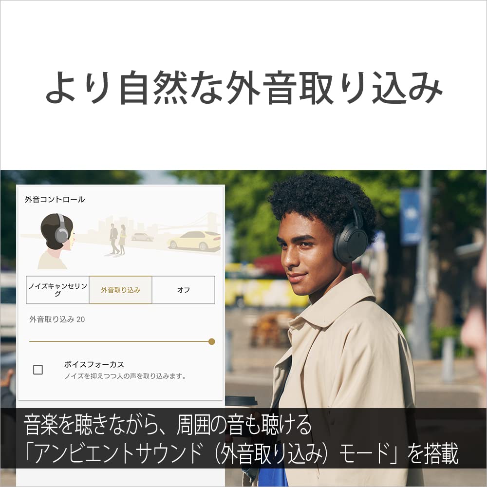 * 音楽を聴きながら、周囲の音も聴ける「アンビエントサウンド(外音取り込み)モード」を搭載。信号処理における外音取り込み量を増やすことで、より自然な外音取り込みを実現します。さらに「ボイスフォーカス」をONにすることで、ノイズを抑えつつ人の声を取り込むことも可能です(*)。*「Headphones Connect」アプリからON/OFFの切り替えが可能です