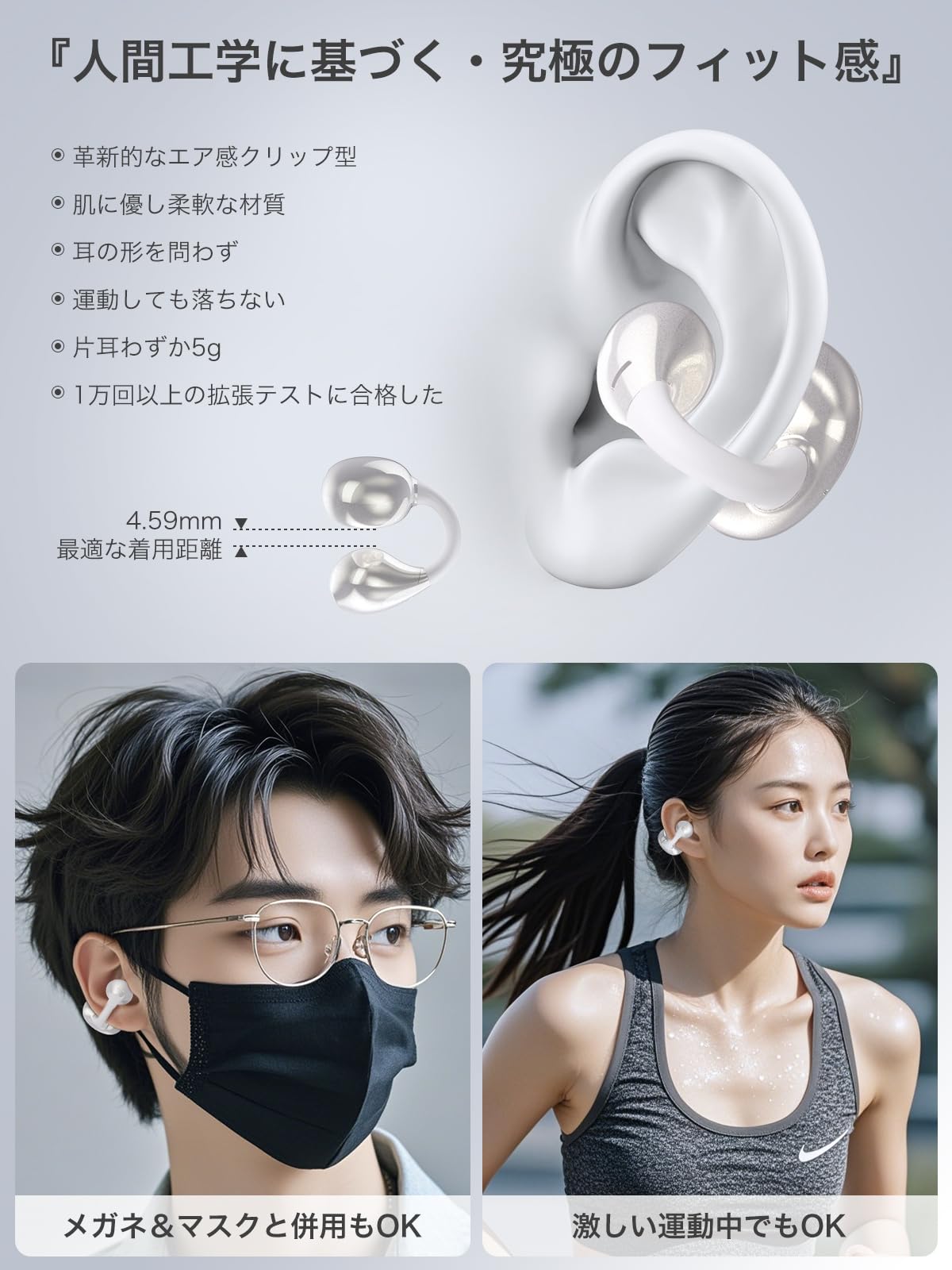 * 【装着感ゼロ!・動いても外れにくい】「SoundClip」OWSイヤホンはイヤカフ式にしております。C型ブリッジ部分に採用したニッケルチタン製形状記憶合金ワイヤーは、耐久性がありつつも高い弾力性を備えるため、さまざまな耳型にぴったりフィットします。また、イヤホンの重さは片耳わずか5.3gで、より軽やかでしっかりとしたフィット感を実現しました。テレワークで1日中装着していても、激しい運動時に付けっぱなしにしていても、自然なフィット感を保っております。「SoundClip」イヤホンはあなたの体の一部になることでしょう。