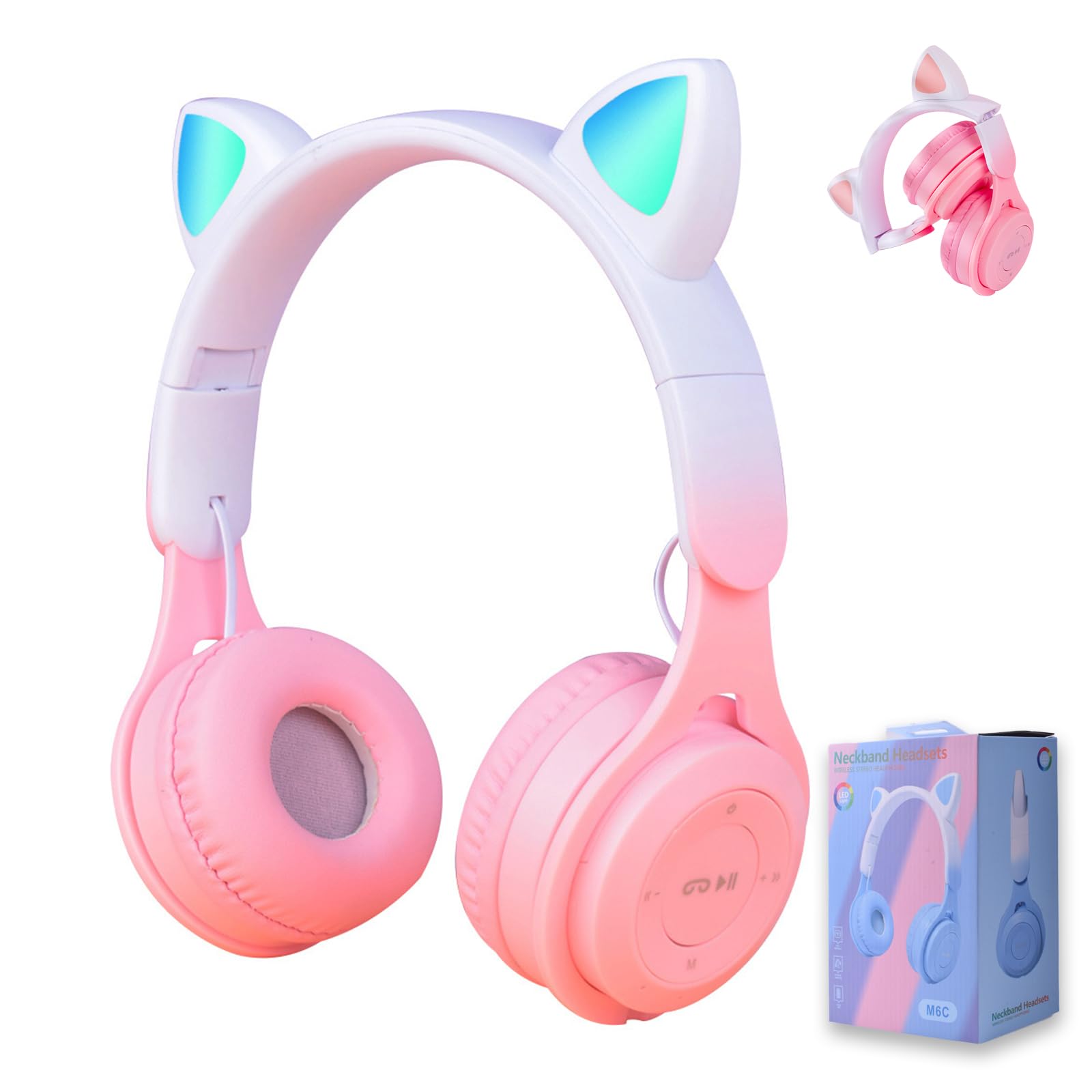 子供用ヘッドホン Megadream無線/有線ヘッドホン マイク付き 猫耳LEDライト/両側RGBライトデザイン Bluetooth5.0/ワイヤ長 1m TFカード挿入可能 折りたたみ式 サイズ調節可能 学校/タブレット/旅行/MP3 (グラデーションピンク)