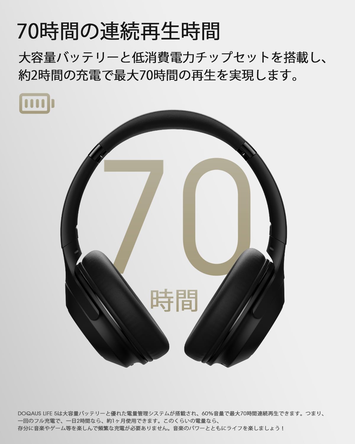 * 大容量バッテリーと優れた電量管理システムが搭載され、60%音量で最大70 時間連続再生できます。つまり、一日2 時間なら、約1ヶ月使用できます。頻繁な充電が必要なく、存分に音楽を楽しましょう