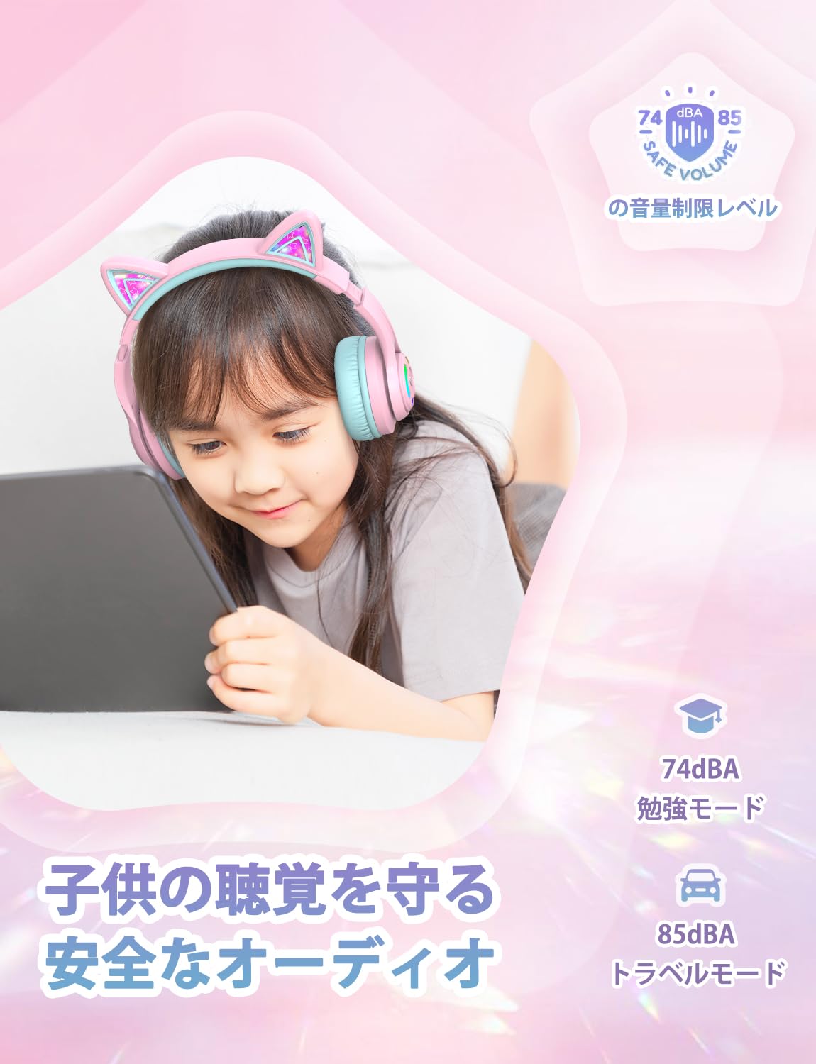 * 最大音量を85dBA に設定しており、機器の誤操作による大音量からお子様の耳を守り、お子様のことを考えた優しいヘッドフォンです。同時に、音量を常に監視する必要がなく、親に安心してもらいます。▲2025年2月~現在販売中のモデルは、WHOの更新に伴い、音量制限機能を「2段階(74/85dB)」に変更しています。