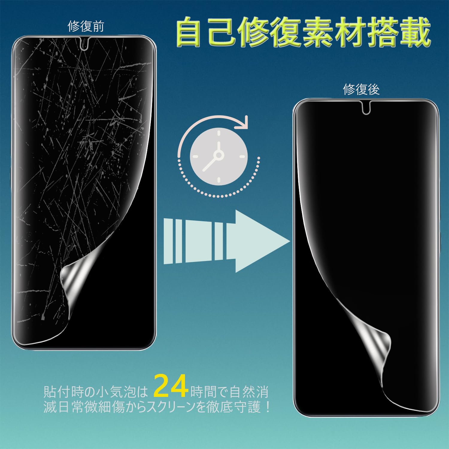 * 【スマートフィルムテクノロジー】:自己修復機能により小さな傷なら時間が経てば目立たなくなる。気泡や小さな傷なら24時間以内に自動的に消える。