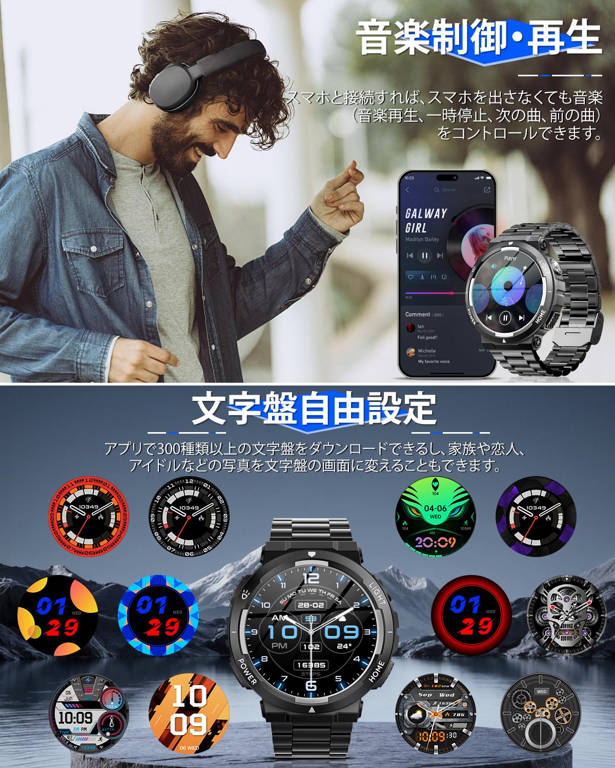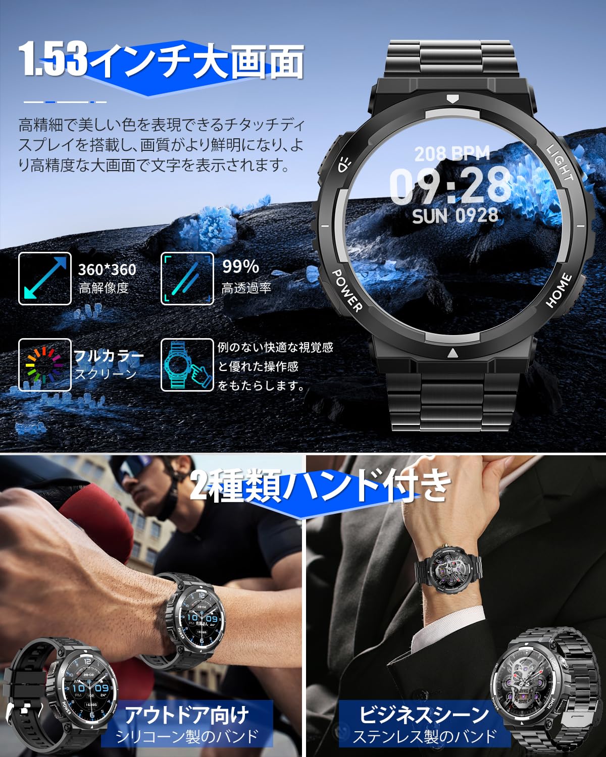 * 【1.53インチ大画面&軍用規格スマートウォッチ】 このスマートウォッチは高精細で美しい色を表現できる1.53インチタッチディスプレイを搭載し、視認性に優れた360*360高解像度大画面を採用され、画質がより鮮明になり、より高精度な大画面で文字を表示されます。例のない快適な視覚感と優れた操作感をもたらします。 更に、このスポーツウォッチは軍用級の材料を採用され、高温・低温・衝撃・防塵防水などの軍事規格認証をクリアして、あらゆる過酷な条件や試練にも耐えることができて、最も信頼できる仲間であります。※お風呂、サウナ、海水、温泉などのご利用はお控えください。