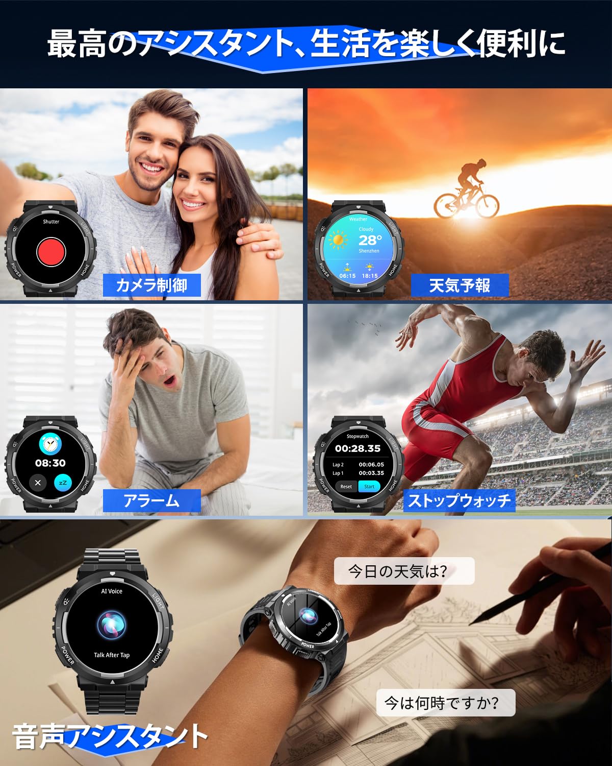 * 【Bluetooth通話&メッセージ通知機能&音声アシスタント】本スマートウォッチはスピーカー&高性能マイクを内蔵され、携帯電話を出さなくても、スマートウォッチでの通話を実現しました。スマホと接続された後に、着信の応答と拒否/電話をかけることなどができます。通話履歴も表示され、通話記録を保存することもできます。両手を解放し、生活、仕事の効率を更に上げます。 また、着信、SMS、LINE、Twitter、Facebook、Instagram、Whatsapp、skype、Viber、Linkedinなどのメッセージ通知と着信通知をサポートします。スマートフォンを出さなくてもすべての内容を確認できます。メッセージの削除もできます。 最新の音声アシスタントも搭載され、腕時計にアシスタント機能を起動して話すだけでスマホの音声アシスタント機能を起動します。