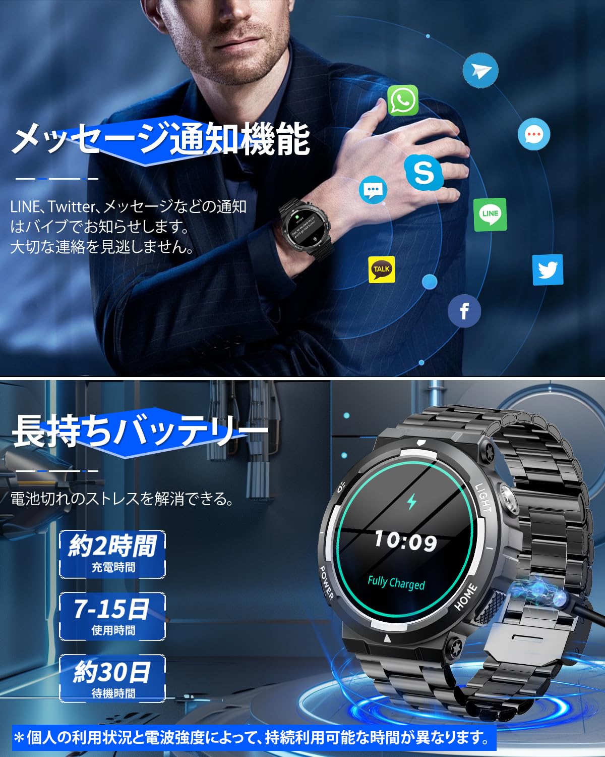 * 【400mAh大容量バッテリー&文字盤カスタマイズ可能】本スマートウォッチは400mahの大容量バッテリーを内蔵し、頻繁に充電する必要がなく、旅行や出張先でのバッテリー切れの心配も不要です。一回のフル充電で7-10日使用でき、電池切れのストレスから解消!(個人の利用状況と電波強度によって、持続利用可能な時間が異なります)。付属の磁気充電ケーブルをスマートウォッチの充電端子に接続すると充電開始となります。また、スマートウォッチ本体の文字盤を搭載する以外、専用アプリで300種類以上の文字盤をダウンロードできるし、お好きの写真も設定可能、家族や恋人、アイドルなどの写真を文字盤の画面に変えることもできます。