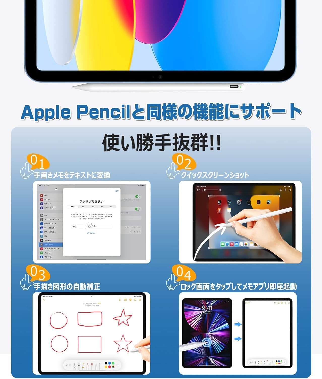 * 【誤作動防止・傾き検知機能】パームリジェクション機能が搭載されているCiscleスタイラスペンを使用すると、手は画面に触れても誤作動にならなく、長時間の作業でも腕が疲れません。傾きを検知できることより、線の太さを自由に変え、絵描きに最適です。5分以上使わないとタッチペンは自動的にスリープモードに切り替え、バッテリーの節約に役立ちます。また、iPadのロック画面からメモを起動・スクリーンショットを撮る、スクリブル機能、図形補正などのアップルペンシルが持つ機能にもサポートしています。