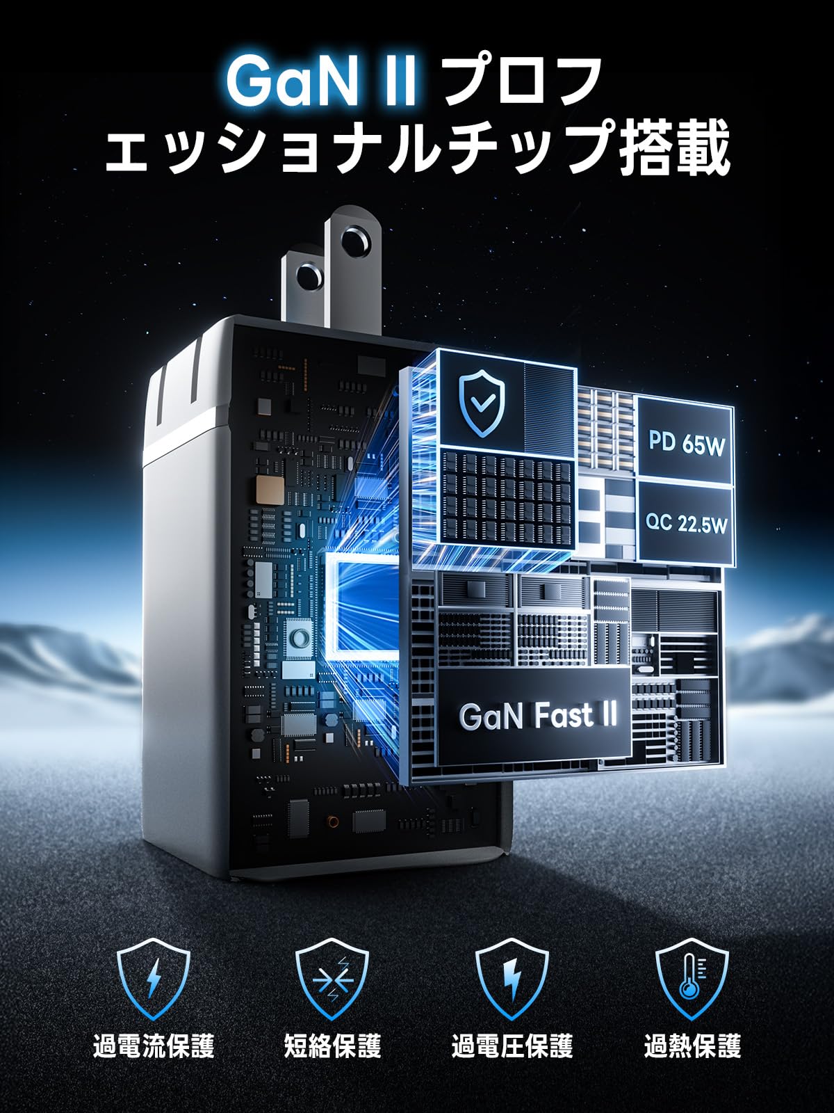 * 【窒化ガリウム技術・折りたたみ式プラグ】:窒化ガリウム(GaN)技術を採用しており、従来のシリコン半導体に比べて電力損失と発熱量が小さくなり、折りたたみ式プラグ設計により、100~240Vの電圧に対応しており、海外へ出張や自宅・職場・旅行など、様々な場所への携帯にも大活躍します。