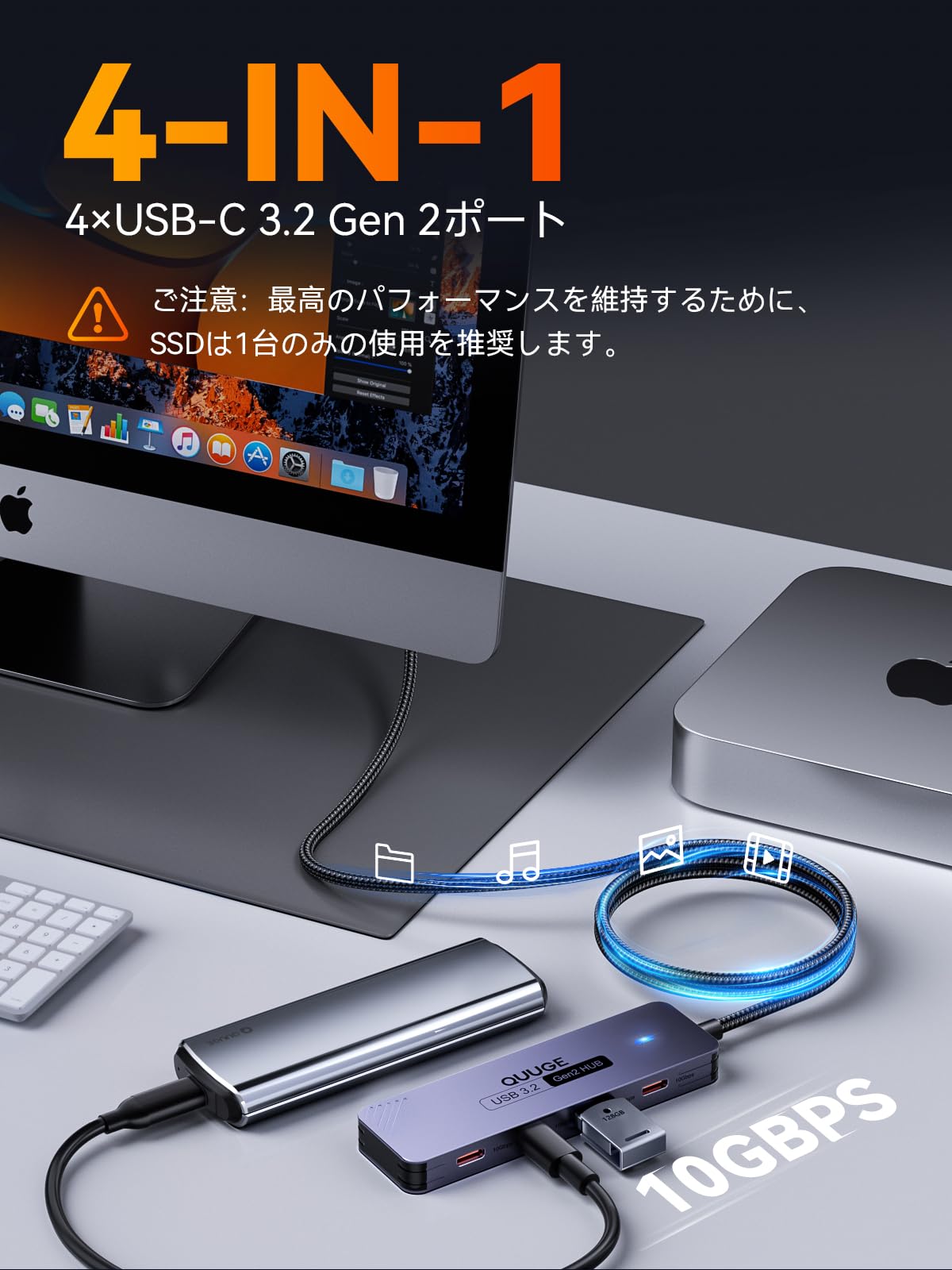 * 【10G時代の幕開け】本 USB ハブ type-c は最新の USB 3.2 Gen 2 規格対応で、データ転送速度は最大10Gbps。旧式のUSB 2.0と比べて、約20倍も高速化しました。大容量のデータもあっという間!例えば20GBのファイルなら、わずか約16秒で転送完了します。4K動画などの大容量ファイルや、たくさんのフォルダをまとめて送るのもストレスフリー。創作活動や業務効率化の強力な味方です。▲ご注意:4ポートはデータ転送専用で、充電・ビデオ出力は非対応。