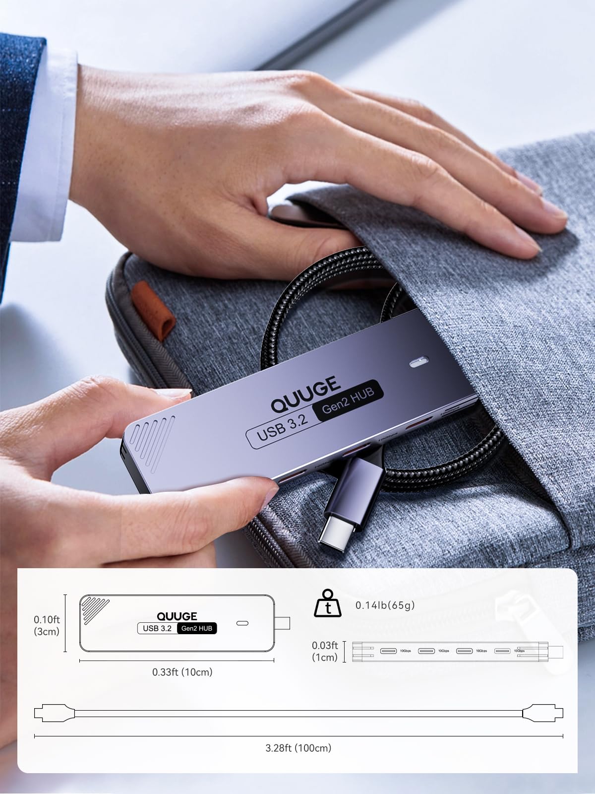 * 【たっぷり100CMナイロン編みケーブル】QUUGEのUSB-C 3.2 10g ハブはたっぷり1メートルのケーブルを採用。デスク下のPC本体や離れた場所にある設備にもラクラク接続。お好きなレイアウトで、快適な作業空間を実現できます。さらにケーブル部はナイロン編み加工を施し、より頑丈で絡まりにくい設計です。断線の心配も少ないため、長期間安心してご使用いただけます。