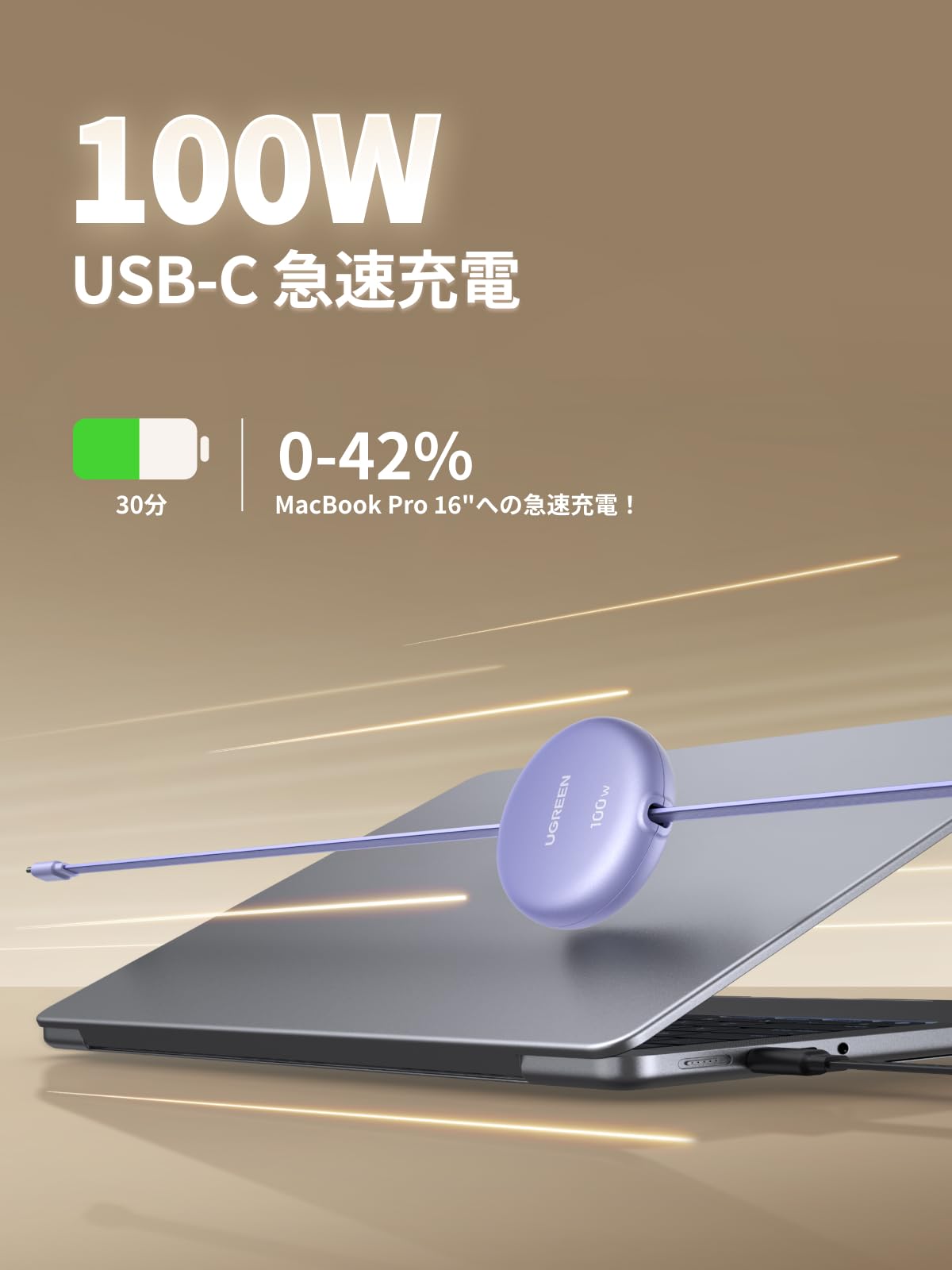 * 【PD 100W/5A 爆速充電】巻き取り式ケーブルの中でも100W/5A怖い出力パワー!超急速の充電ケーブルのトレンド?最大100W/5Aで爆速充電、スマホもノートPCもタブレットも一気にフル充実!利便性と高性能を兼ね備えるUGREEN巻き取り式USB-Cケーブルで、統一感ある充電デスクトップを!