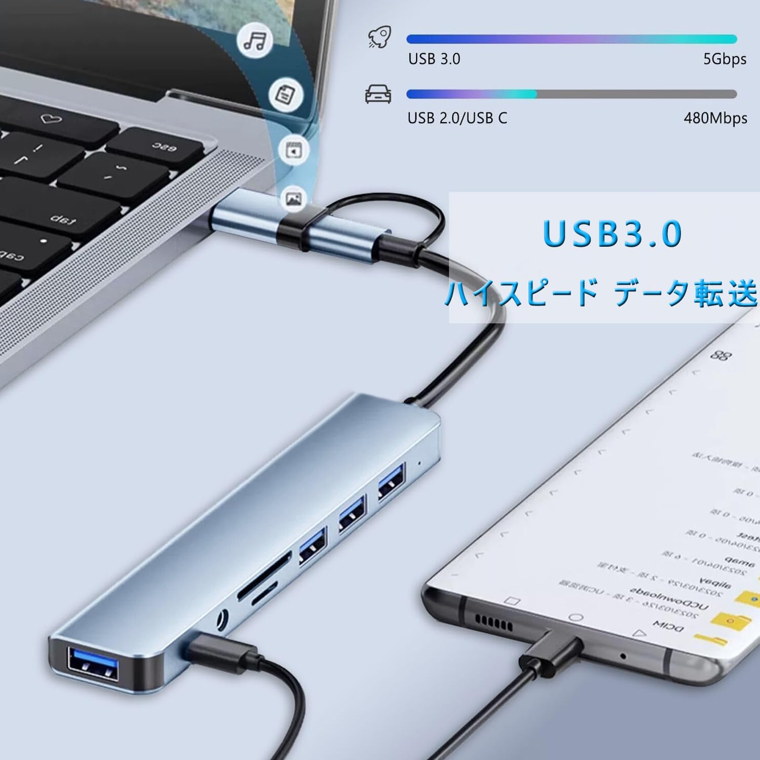 * 【USB3.0高速データ転送】ドライバー不要・アプリ/Bluetooth接続なしで即時使用可能。スマホ/メモリカード/カメラから写真・動画・ファイルを最大5Gbpsの速度でPCに転送。マウス・キーボード・外付けHDD・プリンターなどUSB周辺機器も即時接続。遅延や接続不安定を解消し、クリエイターのワークフローを最適化。SDカードとTFカードのスロットを搭載し、最大読み込み速度は480Mbpsです。注意してください:SD/TFポートは同時に読み込むことができません。(※Type-C 2.0ポートは充電非対応、データ転送専用)。