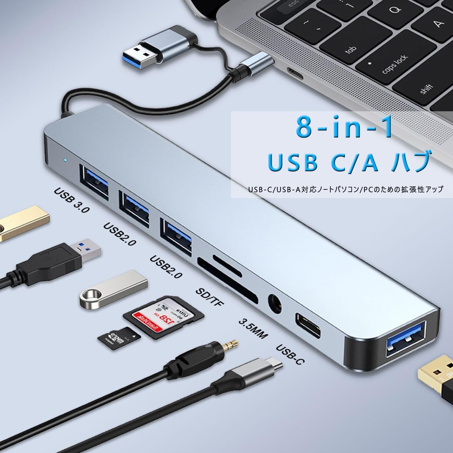 USBハブ 8-in-1 Type-C 拡張ドック usb hub 多機能PC拡張 USB-C/USB-A SD/TFカードリーダー 3.5mmオーディオジャック 超薄型コンパクト 5Gbps 高速転送3.0 iPad Mac android Windows 対応 在宅勤務出張便利