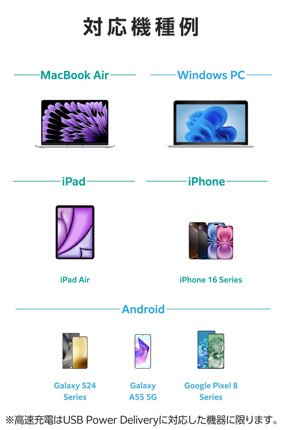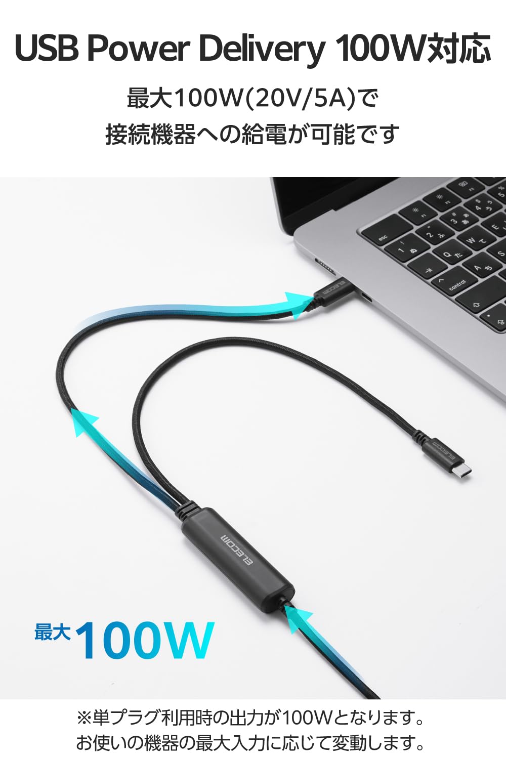 * USB Power Deliveryに対応しており、最大100W(20V/5A)で接続機器への給電が可能です。 ※単プラグ接続時のほか、接続する機器がUSB Power Delivery対応である必要があります。