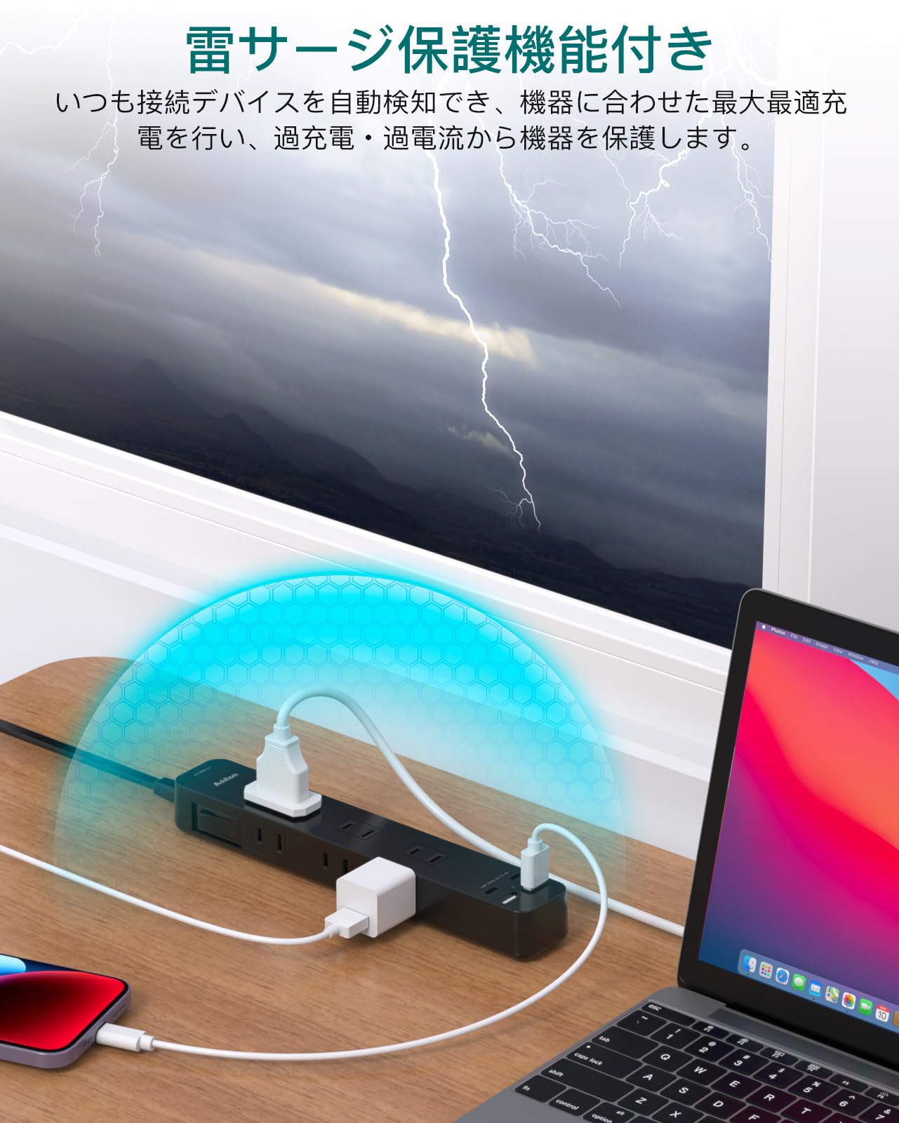 * 【雷サージ保護機能&コンセント4重保護】雷サージ保護機能より、サージ、電圧スパイク、電圧ノイズ、静電気による干渉を排除し、電気製品の耐用年数を効果的に延長します。電気火災を防ぐため、ACプラグの根元に電気を通さない絶縁キャップがついており、トラッキング現象による火災の防止に役立ちます。さらに、AC差込口には、万一の発熱の際にも融解しにくく、電気火災の防止に有効な耐熱性に優れた熱硬化性樹脂を使用しています。電源コードには、二重被ふくコードを採用していますので、断線や被ふく破れによる感電・火災の防止に有効です。