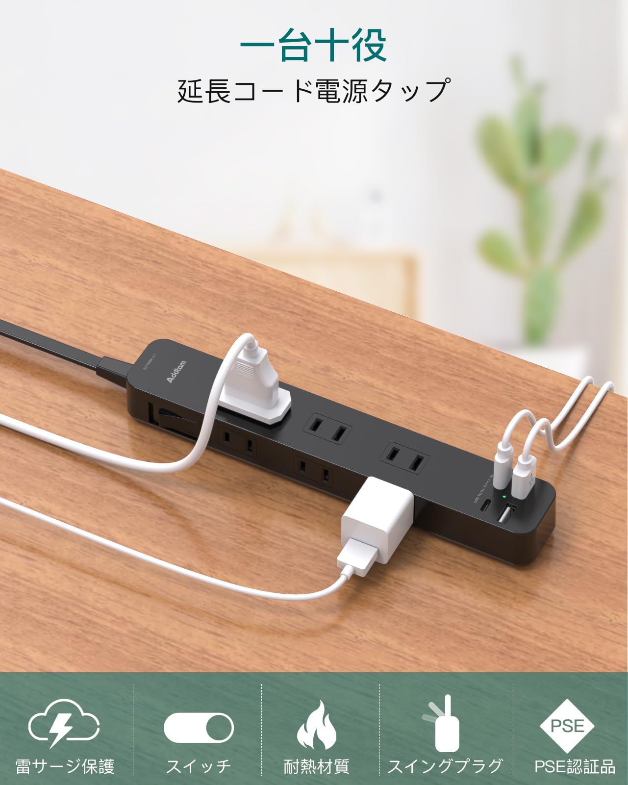 Addtam 延長コード 3m 電源タップ USB充電付電源タップ 6個AC口 2個USBポート 2Type-Cポート 一括スイッチ付き たこあしコンセント テーブルタップ 電源コード 雷ガードOAタップ 壁掛け/卓上に ブラック