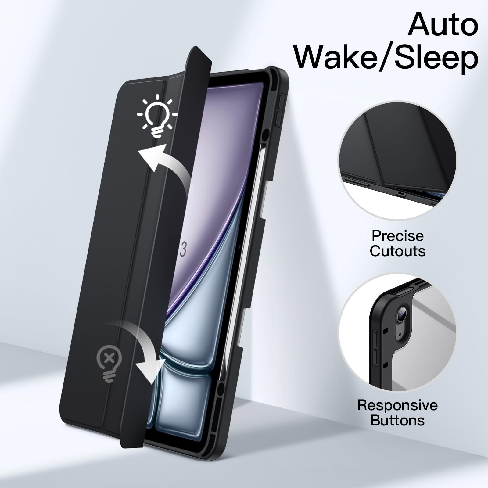 JETech iPad Air 13インチ M3/M2(2025/2024)用ケース Pencilホルダー付き 透明バックカバー スリムスタンド 衝撃吸収 タブレットカバー オートウェイク/スリープ機能 (ブラック)