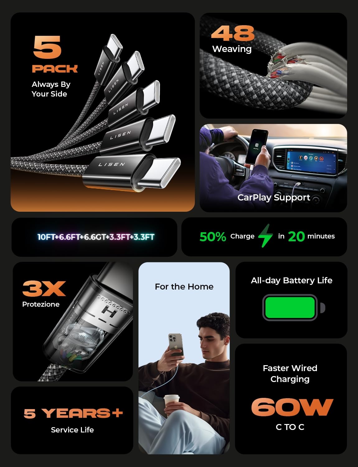 LISEN USB C ケーブル 3m 急速【60W/5本】iPhone ケーブル(家族のデバイス、一セットでまかなう) 高耐久 48本ナイロン織り Type-c 複数デバイス、同時充電の自由へ CtoC iPhone16 15 Pro Max Plus/Switch 2/Galaxy S25 24/ipad/Sharp/Sonyなど対応【1m+1m+2m+2m+3m】ブラック
