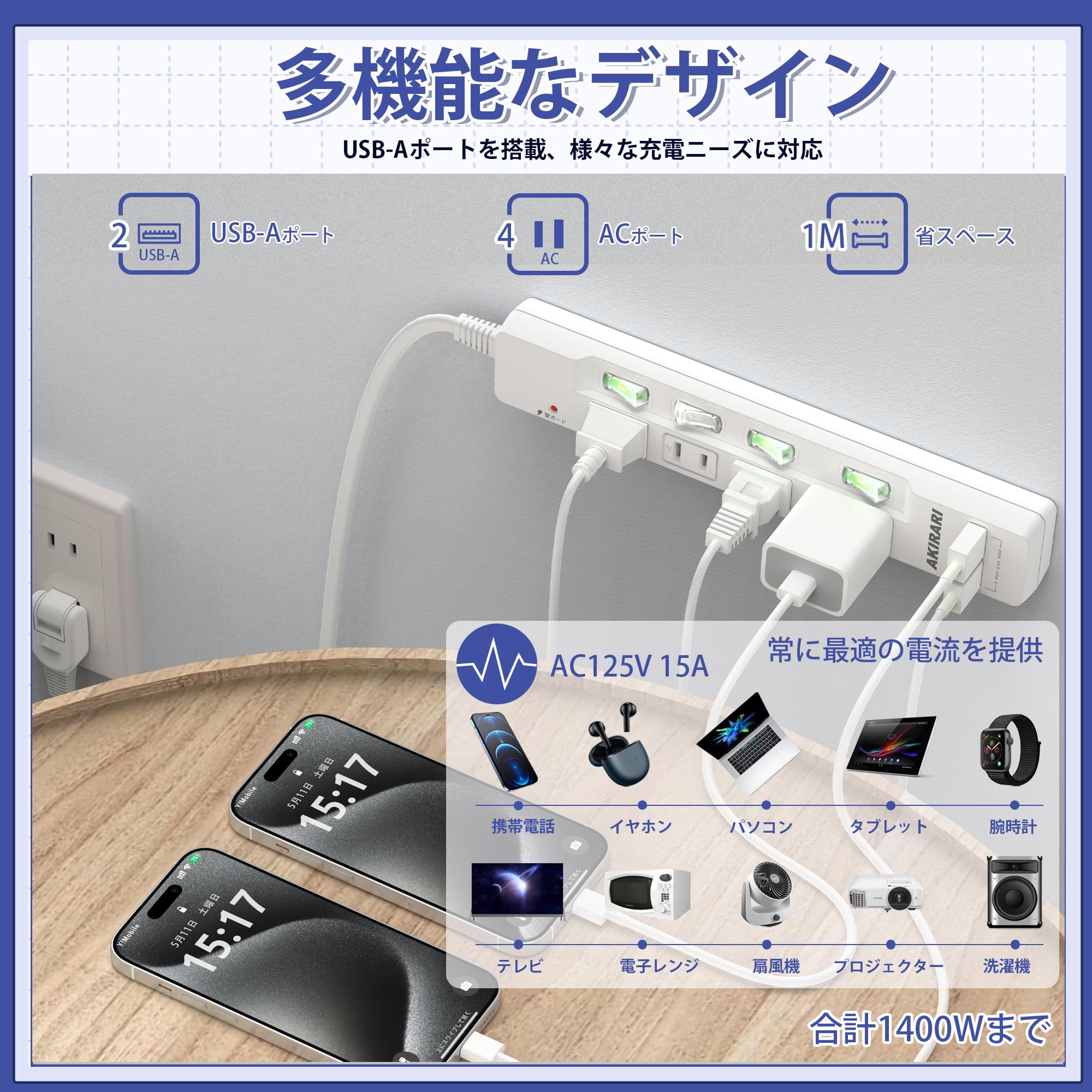 AKIRARI コンセントタップ 4個AC口 2個USB 急速充電 電源タップ 4口 雷ガード ホコリ防止シャッター スイッチ付 ホワイト スイッチ電源タップ テーブルタップ 延長ケーブル 1m 家庭用 6口 4口 ほこりシャッター付 過電圧 過電流 過熱保護 すき間 180度スイングプラグ トラッキング防止 節電 省エネ 延長コード おしゃれ 電源 壁 卓上 薄型 (1m) (1個セット)