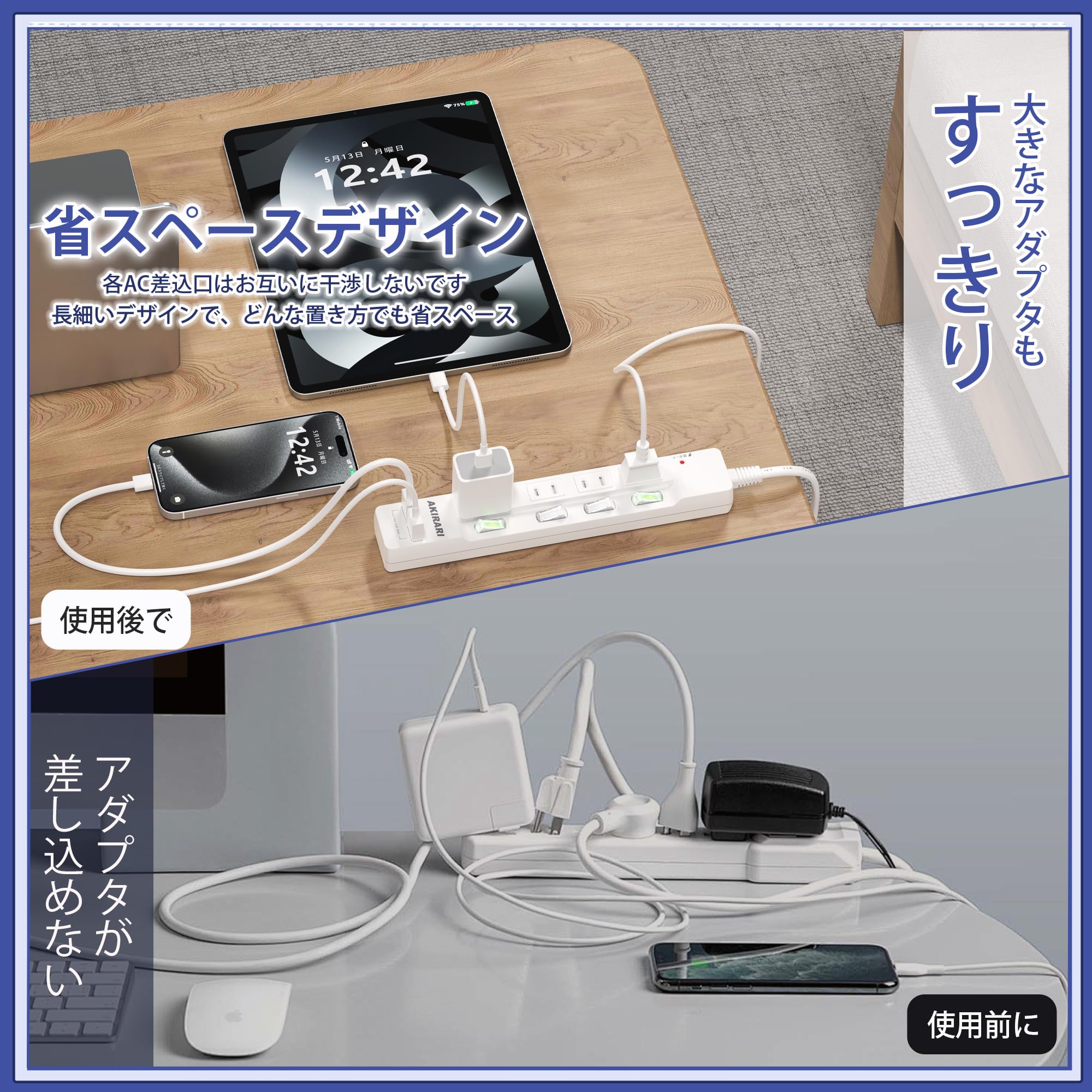 * 【安全性重視 日本メーカー】 4個AC口 2個USB シンプルなデザインで本体には耐熱性に優れたユリア樹脂を採用。さらにトラッキング防止機能もあり、火災のリスクを低減できます。