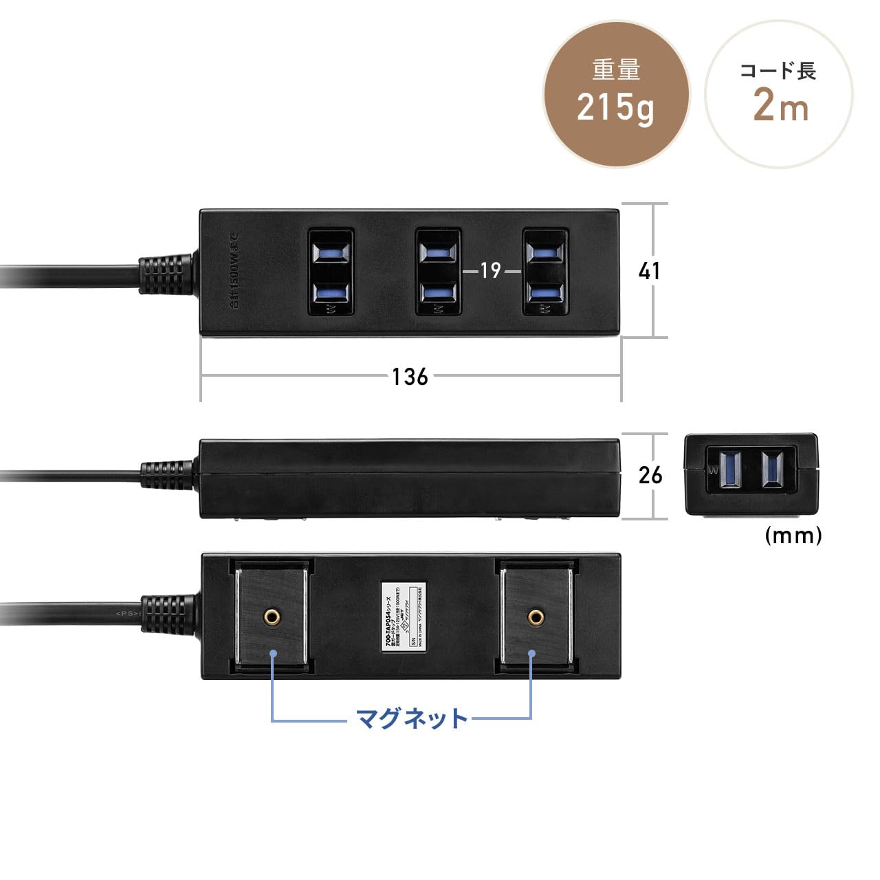 * コード の長さは2m。デスク上から壁のコンセントまでなどに配線できる 延長コード です。