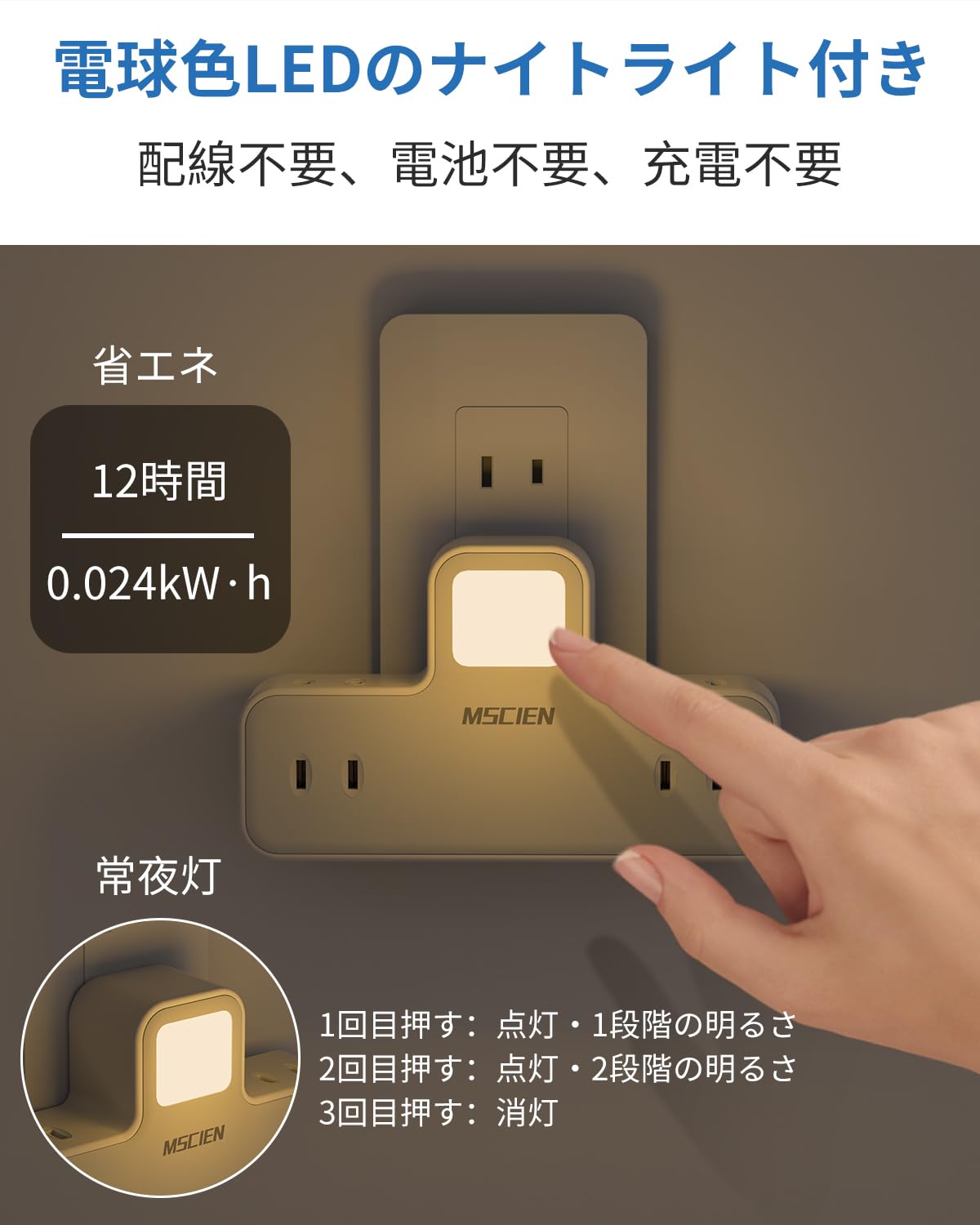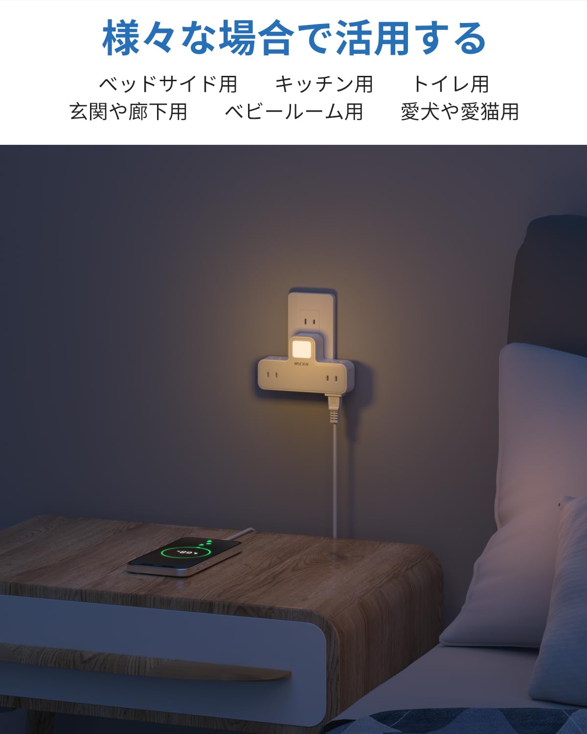 Mscien LEDナイトライト コンセント 電源タップ 6個AC口 コンセントタップ 分岐 たこあしコンセント スイングプラグ マルチタップ 直挿し おしゃれ フットライト 明るさ調節可 足元灯 常夜灯